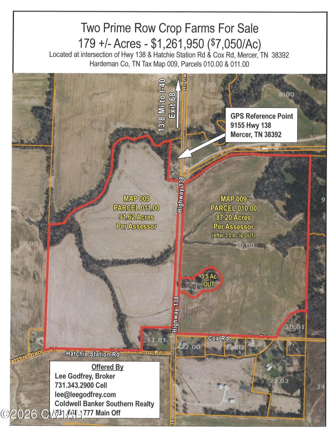 Your opportunity to own two prime row crop farms in Hardeman Co, 13.8 miles of I-40. Tax Maps 009, Parcels 010.00 & 11.00 lying on either side of Hwy 138. Approximately 148 ACRES IN ROW CROP, balance in woods and nonproductive land. Map 009, Pc 010.00 lies on the Northeast corner of Hwy 138 & Cox Rd, Map 009, Pc 011.00 lies on the Northwest corner of Hwy & Hatchie Station Rd. Total of 1.2 Miles (6410+ Ft) of blacktop road frontage. Both farms are currently rented, call listing agent for details. Adjacent owner's GPS address: 9155 Hwy 138, Mercer, TN 38392.