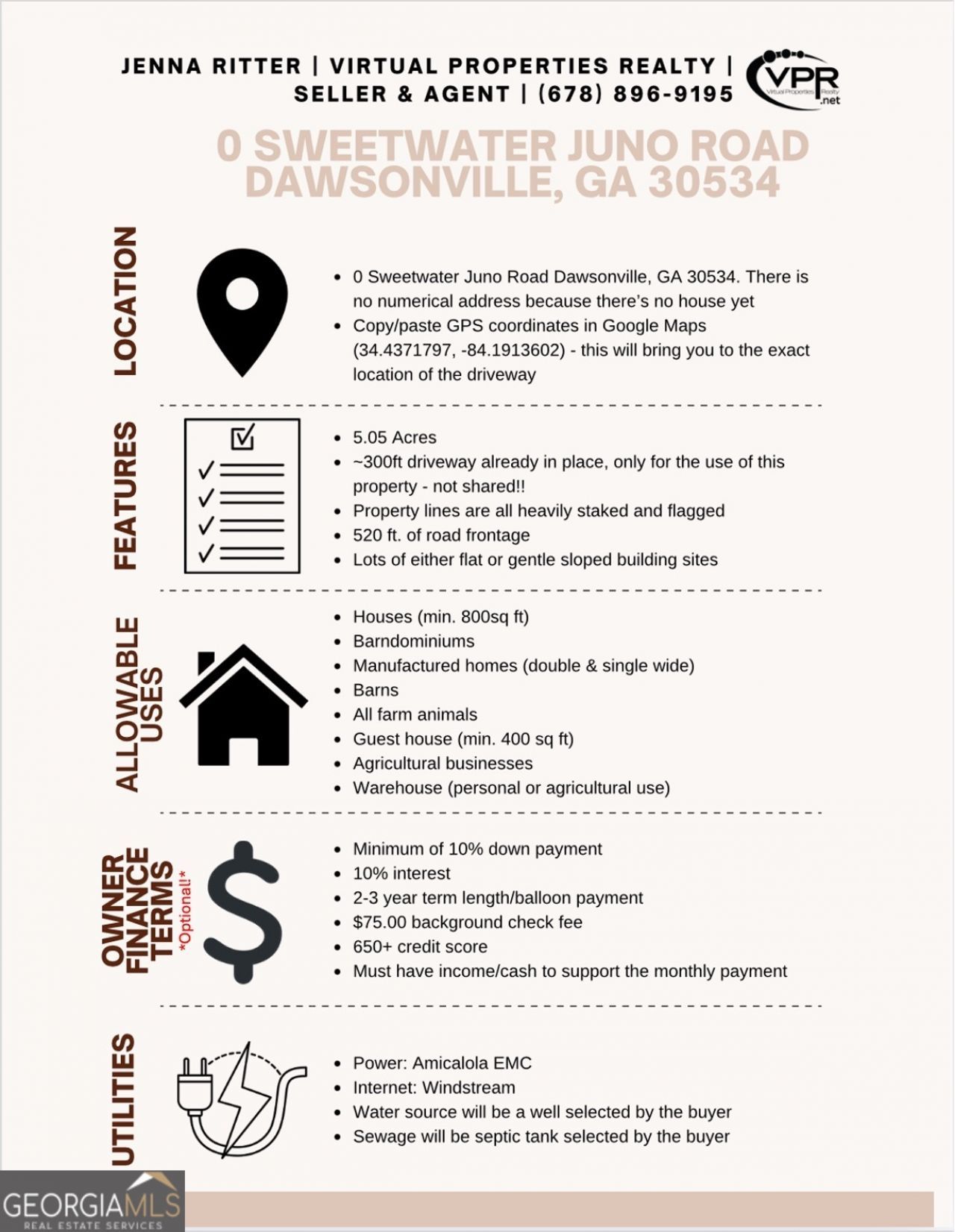 *The real estate agent is the seller/owner* FLAT 5 Acre tract in Dawson County with a 300ft driveway already in place! Secluded off of quiet, paved county maintained Sweetwater Juno Road, where Agricultural zoning requires a minimum of 5 acres - never worry about high density subdivisions anywhere near here. No nosy neighbors remotely in sight, or an HOA dictating what you can or cannot do on your own property! Perfect for absolutely ANYTHING - slab home, manufactured home, basement home, barndominium - YOUR CHOICE! Accessory buildings ALLOWED - build a barn for your animals or agricultural business. Sick of your adult children living at home? Or have nowhere to put your mother-in-law? Or want passive income from hikers, hunters or Dawson Motor Sports? Problem solved - you can have TWO residential structures on the property! The main house must be at least 800 sq ft, the secondary one must be at least 400. Uniquely located - almost in the National Forest, yet practically next door to the Atlanta Motorsports Park where multi-millionaires from all over the country store and drive their Porches and Lamborghinis. Travel often? Only 55 minutes to the North Springs MARTA station. For those that wish to check the site out on their own - please note the +/- 300ft gravel drive extends onto another property, but is not used by that property or any other property. There is a steel wire cable across the gravel drive at the edge of the property line. Feel free to park your vehicle on the gravel drive while you walk the property. There is a partial line wire fencing along southern road frontage, gravel drive and northeastern property line with full fencing along rear (eastern) property line (see photos). Large deer stand near rear of property for immediate use overlooking open area of Club Moss. Rear of property backs up to a $3M+ 70 acre equestrian ranch. Property will be served by well and septic (selected by buyer). Full perimeter is flagged, with rough trimmed foliage to navigate at your leisure (don't forget your boots and long pants). Copy and paste GPS coordinates to gravel drive into Google Maps (34.4371797, -84.1913602). Owner financing is available. Terms: 10% down, 10% interest rate, 3yr term/balloon (negotiable). Land or residential trade also considered.