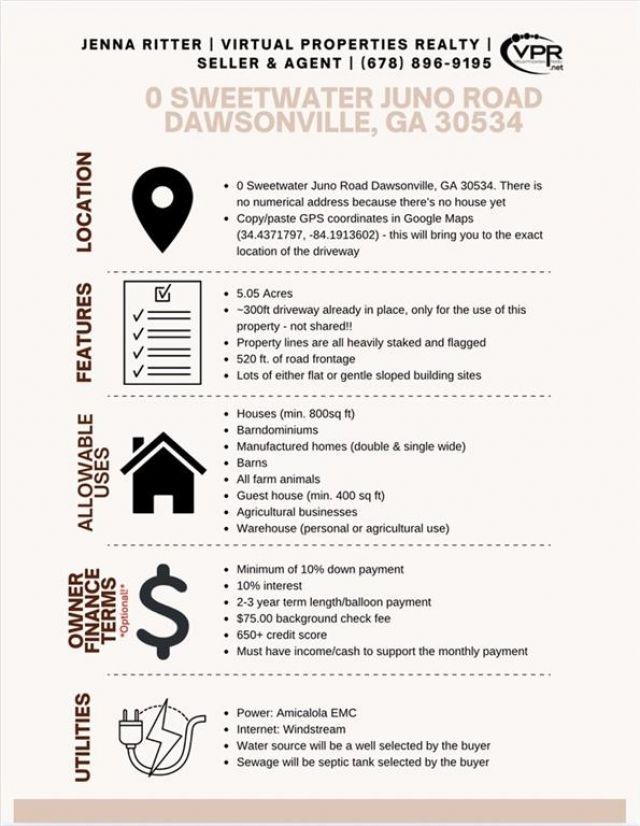 *Seller is also the agent!* To find the property's specific location, Copy and paste GPS coordinates into Google Maps (34.4371797, -84.1913602). FLAT 5 Acre tract in Dawson County with a 300ft driveway already in place! Secluded off of quiet, paved county maintained Sweetwater Juno Road, where Agricultural zoning requires a minimum of 5 acres - never worry about high density subdivisions anywhere near here. No nosy neighbors remotely in sight, or an HOA dictating what you can or cannot do on your own property! Perfect for absolutely ANYTHING - slab home, manufactured home, basement home, barndominium - YOUR CHOICE! Accessory buildings ALLOWED - build a barn for your animals or agricultural business. Sick of your adult children living at home? Or have nowhere to put your mother-in-law? Or want passive income from hikers, hunters or Dawson Motor Sports? Problem solved - you can have TWO residential structures on the property! The main house must be at least 800 sq ft, the secondary one must be at least 400. Uniquely located - almost in the National Forest, yet practically next door to the Atlanta Motorsports Park where multi-millionaires from all over the country store and drive their Porches and Lamborghinis. Travel often? Only 55 minutes to the North Springs MARTA station. For those that wish to check the site out on their own - please note the +/- 300ft gravel drive extends onto another property, but is not used by that property or any other property. There is a steel wire cable across the gravel drive at the edge of the property line. Feel free to park your vehicle on the gravel drive while you walk the property. There is a partial line wire fencing along southern road frontage, gravel drive and northeastern property line with full fencing along rear (eastern) property line (see photos). Large deer stand near rear of property for immediate use overlooking open area of Club Moss. Rear of property backs up to a $3M+ 70 acre equestrian ranch. Property will be served by well and septic (selected by buyer). Full perimeter is flagged, with rough trimmed foliage to navigate at your leisure (don't forget your boots and long pants). Owner financing is available. Terms: 10% down, 10% interest rate, 3yr term/balloon (negotiable). Land or residential trade also considered.