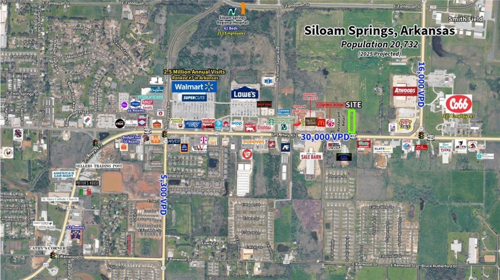 Excellent frontage and visibility on US Hwy 412 E. Located on the edge of the expanding commercial district of Siloam Springs with utility access. Great access to/from Hwy 412 E.