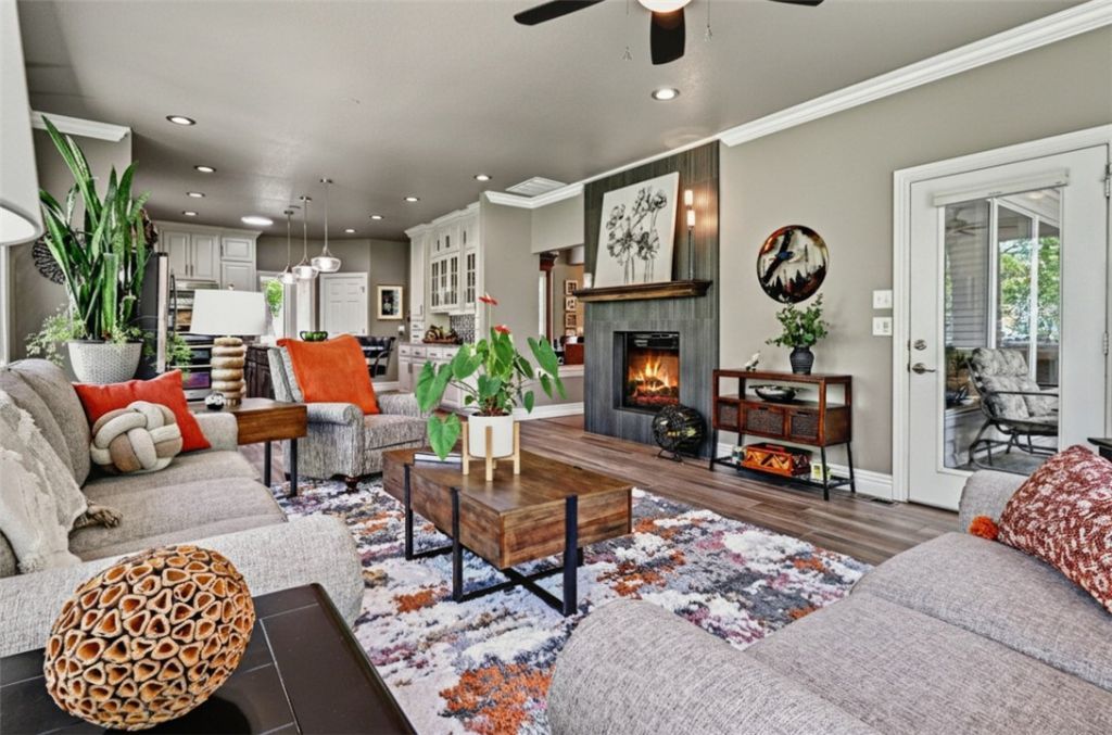Quality-built with timeless OAK construction and a recently updated interior, this home blends craftsmanship with modern comfort. The open kitchen features a large island, pantry, and oversized appliance cabinet, flowing seamlessly into the hearth room with floor-to-ceiling windows for abundant natural light. Ideal for entertaining, enjoy a formal dining room and spacious living area, plus a private office just off the kitchen. The large primary suite offers a tray ceiling with rope lighting, and a bath with double sinks, vanity area, and a walk-in tower shower. A half bath and laundry are conveniently located nearby. The lower level includes spacious bedrooms, a great room with patio access, and a hobby room with exterior doors. Relax on the updated composite deck. Conveniently located near I-49, trails, golf, tennis, and pools. See attached amenities and updates list.