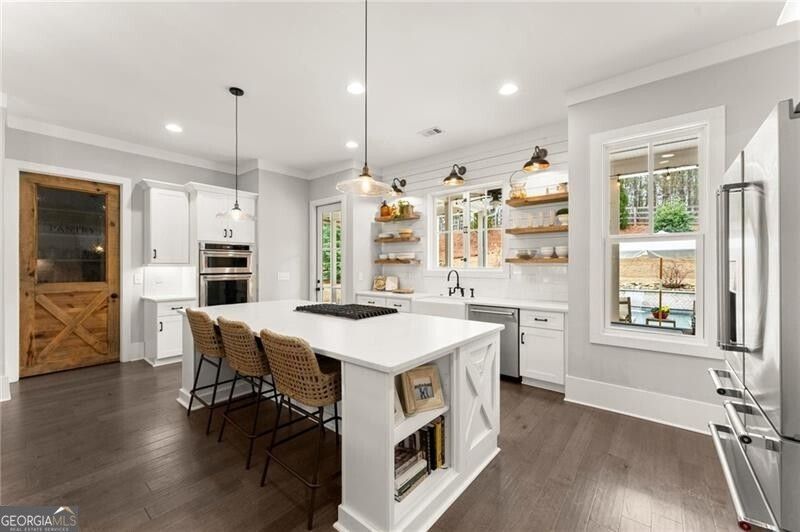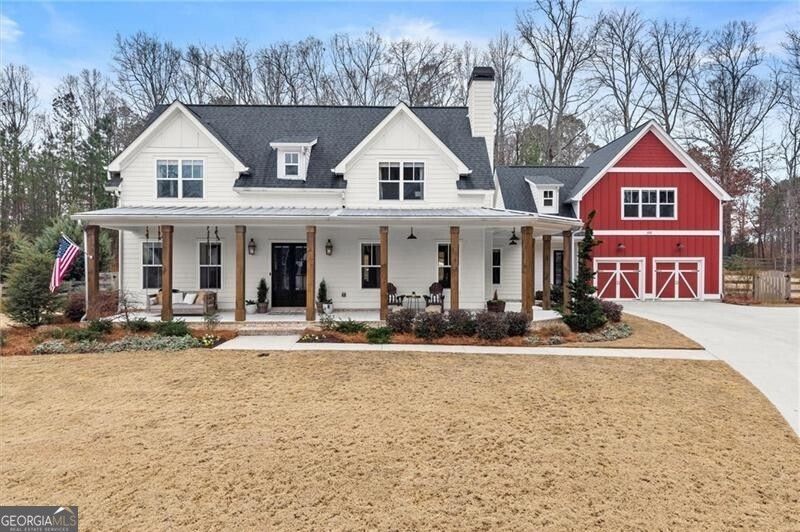 Modern farmhouse style meets high end functionality in this meticulously designed and cared-for home. Set on a professionally landscaped lot, the home balances sophistication with warmth, and a layout that flows easily from one room to the next. At the heart of the open-concept main floor is a chef's kitchen equipped with textured & honed quartz counters, stainless appliances, an enormous walk-in pantry, and custom cabinetry for effortless organization. The adjacent great room is the home's focal point, featuring beamed ceilings and a fireplace that anchors the space. Practicality is woven into luxury, too: the oversized mudroom includes a custom pocket gate for pets and a dedicated exterior entrance to keep daily clutter contained. The main-floor primary suite is a retreat, featuring a spa-inspired bath with a deep soaking tub. Upstairs, you'll find three oversized bedrooms and two full baths, while a private fifth bedroom suite is tucked away above the garage-an ideal setup for a home office, gym, or long-term guests. The backyard is a full-scale private resort. The heated pool and spa feature a UV sanitation system for easy, chlorine and salt-free maintenance. An oversized covered patio with its own outdoor fireplace and separate firepit, the grounds are built for year-round entertaining. Located in the top-rated Sequoyah School District and just a short drive from the dining and nightlife of Downtown Woodstock, this property isn't just a home, it's a lifestyle upgrade.