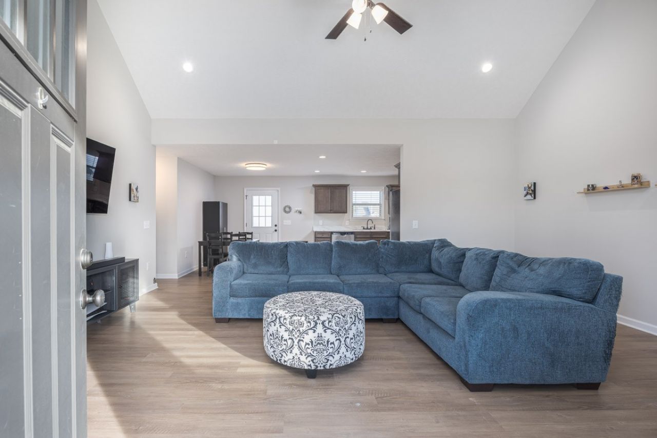 Welcome home to this open & airy floor plan featuring cathedral ceilings and a stunning kitchen complete w/ mocha cabinetry, oil rubbed bronze hardware and SS appliances - including the refrigerator. The spacious primary suite offers a beautiful tray ceiling, full bath w/ double vanities and an oversized 6x12 walk-in closet. The laundry room includes custom shelving and the washer and dryer will remain. All closets are outfitted with custom wooden shelving and ceiling fans enhance every bedroom and living area, along with 2 blinds throughout. Situated on approximately one-third of an acre, this property offers plenty of space to spread out and enjoy. Relax on the charming rocking-chair front porch in this quaint community with no drive through traffic. The fenced backyard is perfect for kids or pets and features a nice deck for outdoor enjoyment. The storage building remains. Ideal for remote work, the home is equipped with TDS high-speed fiber internet.