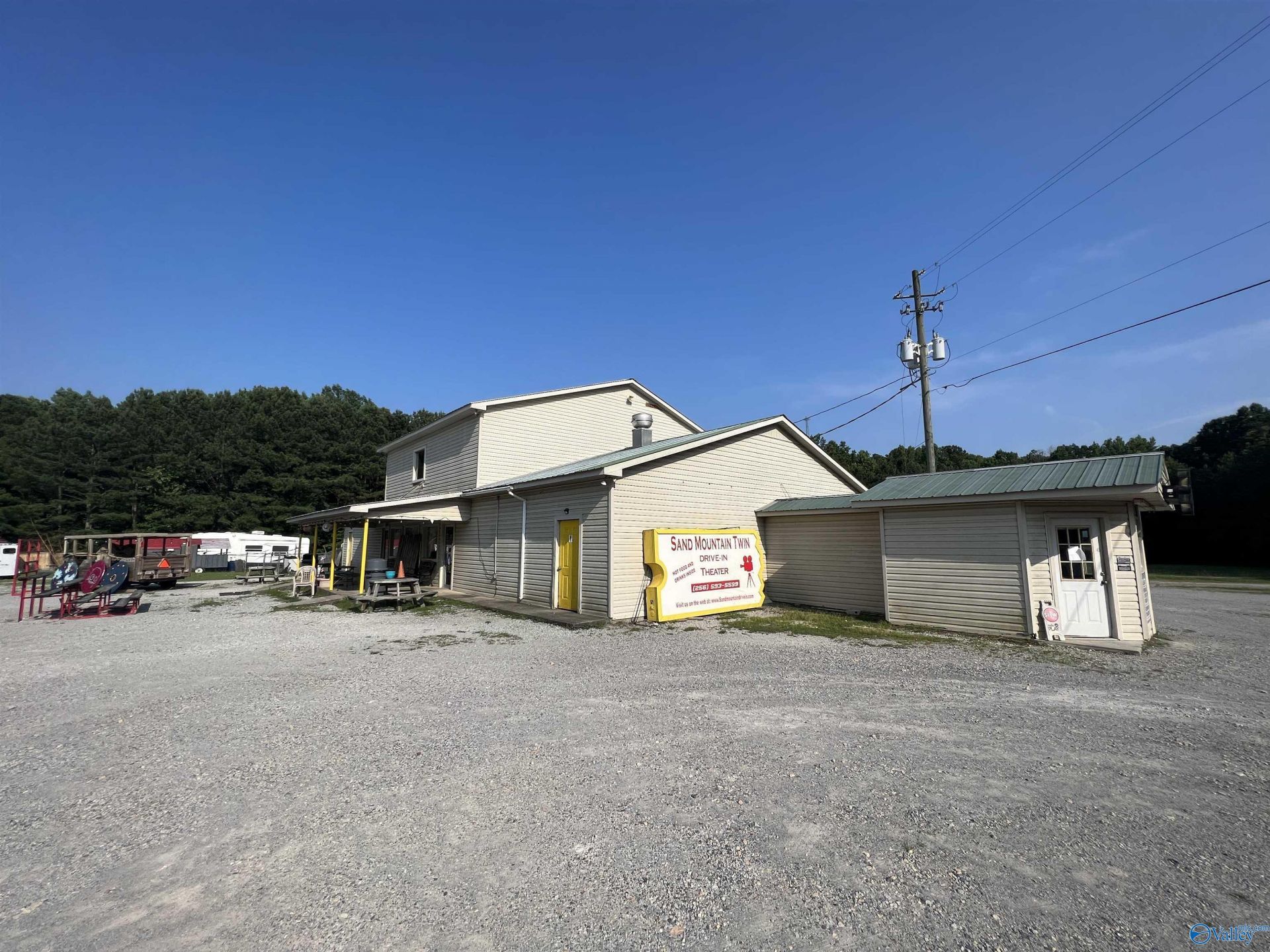 ACREAGE - UNIQUE PROPERTY ? LOTS OF OPPORTUNITY! Formerly the Sand Mountain Twin Drive-In, this 22.45 acre+/- property offers endless potential. Features include a mobile home, original drive-in building with kitchen & bathrooms, two movie screens, and theater equipment (some repairs needed). Concession setup includes equipment for popcorn, hot dogs, pizza & more. Less than half the land is cleared for the drive-in, with the remainder wooded and a wet weather creek along the back. Ideal for a residence, business venture, or future development! The mobile home at the front of the property is currently occupied. Call today to schedule a showing!