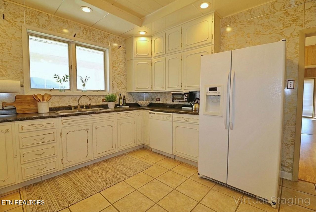This 1744 sq. ft. single-story residence in Oneida, TN offers a blend of comfort and functionality. The home boasts 2 bedrooms, including a generous 190 sq. ft. primary bedroom, and 2 bathrooms. The layout incorporates a family room, living room, formal dining room, kitchen, office, and large closets.Throughout the home, wood paneling and beautiful laminate floors create a warm, cohesive aesthetic. Large windows in multiple rooms flood the space with natural light, enhancing the open feel. The kitchen features white cabinetry, dark countertops, and a tiled floor, balancing classic, mid-century modern, and contemporary elements. Both bathrooms nicely sized, and well appointed, with one showcasing a striking yellow accent wall. The exterior features large , flat yard, 2 car, attached carport, as well as a detached garage/workshop that has 2 more carport spaces and a garage door that will accommodate a small car, mower, or ATV. To the front side of the house, will also find the steps and door to the huge crawlspace, which adds nice additional storage or workshop area.The living areas are spacious and adaptable, with ceiling fans for comfort. The home's layout, as seen in the 3D floor plan, offers a good flow between spaces, making it suitable for both everyday living and entertaining. This property presents a comfortable living environment with updated features while maintaining a touch of mid-century modern charm.