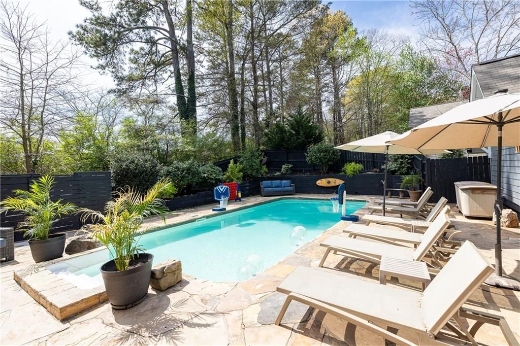 FABULOUS NEW PRICE! Welcome to your oasis just minutes from East Atlanta Village! Situated on a quiet cul-de-sac in sought-after Burgess-Peterson Elementary district, this gorgeous home, boasting double level porches on the front and a heated salt water pool in the back, has been expanded and renovated throughout making it one of the largest homes in the neighborhood. The inviting entry foyer opens to a sunny main level bedroom on the right with a bay window that also makes the perfect office. The adjoining bathroom has been updated to include a frameless shower and a marble-topped vanity, walk-in closet and linen closet. The open living area features a fireside family room open to the dining/breakfast area and a completely renovated kitchen enhanced by GE Cafe double ovens and microwave, gas cooktop, 2 dishwashers and a French door fridge. The quartz countertops and detailed backsplash compliment the cabinetry (all soft-close) beautifully. Open the sliding door to the backyard and easy access to the garage. The keeping room addition off of the family room features built-in bookshelves and built-in banquette seating for 6 as well as a full pool bath and pool access. The upper level offers a total of 4 bedrooms and 2 baths. The spacious and bright owner's suite opens through a French door to a private porch. The renovated bathroom features a tiled walk-in shower with frameless doors, soaking tub, double vanity with quartz countertops and a walk-in closet. The 3 additional bedrooms offer great possibilities with two of them having loft set-ups to maximize space. The hall bath has marble topped double vanities, walk-in shower w/ frameless surround, soaking tub and a walk-in closet. Rounding out the upstairs is a laundry room with ample storage.The fully fenced backyard is an entertainer's dream and features a pool with large stone patio area for sunning and play. The deck offers shaded dining beneath the pergola. The detached one-car garage is perfect for parking or storage. Hardwood floors throughout both levels. Additional upgrades include encapsulation of the crawlspace, a new furnace & heat pump in 2025, a dedicated irrigation meter and Container Store closets. Districted for sought-after Burgess-Peterson Elementary.