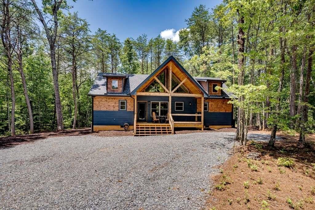 This Beautiful Newer, FULLY FURNISHED, 2 bedroom cabin, will take your breath away from the moment you drive past the small lake, to the moment you open the door and enter into this picturesque custom built mtn home, with 20 foot floor to ceiling windows, that allows a gorgeous view to the outdoor stone fireplace and the 1.56 acres of woods, that surround the cabin. The open concept floor plan has original blue pine wood Walls & ceilings, original pine flooring and natural light throughout. Enjoy relaxing by the gas log fireplace inside or choose to sit on the back porch, that has 35 foot cathedral tongue and groove ceilings, while enjoying the outdoor stone wood burning fireplace, while relaxing in the 6 person hot tub. Plenty of outdoor living space for relaxing, making smores at the fire pit, hiking on your own hiking trail around the entire 1.56 acres of level land, to playing many of the games, including corn hole, hook and ring toss or watch your favorite shows on the 65 Smart Samsung TV above the outdoor fireplace. Enjoy dining outside with the 6 person dining table w/ swivel chairs & a cooler in the middle of the table to keep your drinks cold. There is plenty of backyard space or take a quick stroll to the small lake. Relax by the newly built fire pit with tree stump end tables for your drinks. Inside this amazing cabin, cook all your meals in the open concept kitchen with a custom wood island. The two bedrooms, each have King size beds and the Queen size pullout sofa in the family room. Wait until you see the oversized spa like shower in the master bathroom w/ a custom bench! All the countertops in the kitchen and bathrooms are leathered granite. This cabin sits on a corner lot, so one of the most private lots in the community, w/ only one neighbor on one side of the cabin. The cabin is 18 mins to downtown Blue Ridge, 7 mins to the Riverwalk in downtown McCaysville, 25 mins to Harrah's Casino in Murphy, NC & 17 mins to the Ocoee whitewater Center. Paved rds in sub! SHORT TERM RENTALS ALLOWED!