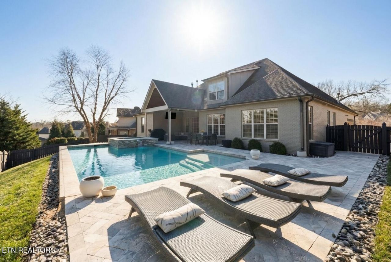 This stunning brick and stone estate home captures the essence of luxury living in Knoxville's prestigious Copperstone at Choto community, offering approximately 3,883 square feet of sophisticated living space defined by soaring cathedral ceilings, exposed wood beams, and hardwood flooring. The versatile floor plan features a total of 6 spacious bedrooms and 4 full bathrooms, including a convenient main-level master suite, with a rare amount of 3 additional bedrooms on the main level. Upstairs is a theater room in which the projector and shuffle board table convey's with an 2 additional bedrooms. The backyard is anchored by a luxurious private gunite pool and spa with rapid heat along with stylish high end travertine pavers patio. Entertain and relax under the covered patio area while listening to the integrated sound system designed for year round outdoor living! Modern and stylish amenities abound, from the gas-log fireplace and custom built-ins to the side-entry two-car garage with extra parking. Perfectly situated on a professionally landscaped lot within the top-rated Northshore and Farragut school districts, this property offers a rare combination of scenic tranquility and neighborhood convenience with access to a community clubhouse and pool. Don't wait opportunities like this don't come along often!