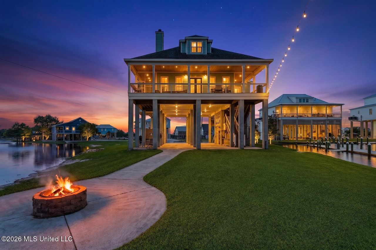 Heaven on Earth perfectly describes this exceptional furnished waterfront retreat, offering breathtaking panoramic views from nearly every room. Custom-built in 2015 by Garcia & Sons, this home showcases thoughtful craftsmanship and refined coastal living. Enjoy cool bay breezes and unforgettable sunsets from the expansive porch or the pier-side gazebo. Designed for effortless entertaining, the open-concept living area flows seamlessly into a gourmet kitchen featuring a five-burner induction cooktop and high-end finishes. Just off the kitchen, a sunroom captures stunning water views year-round. The first-level primary suite is a private sanctuary, complete with its own screened porch overlooking the water. Upstairs, you'll find two additional bedrooms, a full bath, a comfortable sitting area, and a versatile bonus bunk room?ideal for guests. Boating enthusiasts will appreciate the impressive 70-foot dock constructed with durable composite materials, along with approximately 478 feet of vinyl bulkhead along Bayou La Croix. Outdoor amenities abound, including a fully equipped outdoor kitchen, shower, and bathroom?perfect for entertaining and coastal living. Additional features include a 1,500 lb lift with access to both the foyer and mid-deck storage, upgraded horizontal wire balcony railings for a clean, low-maintenance aesthetic, enhanced electrical capacity at the dock, and RV-ready hookups beneath the home for visiting guests. The property also includes a wood-burning fireplace, wired security system with cameras, built-in speakers, and a sprinkler system. This is coastal luxury at its finest?where every detail has been designed for comfort, beauty, and unforgettable waterfront living.