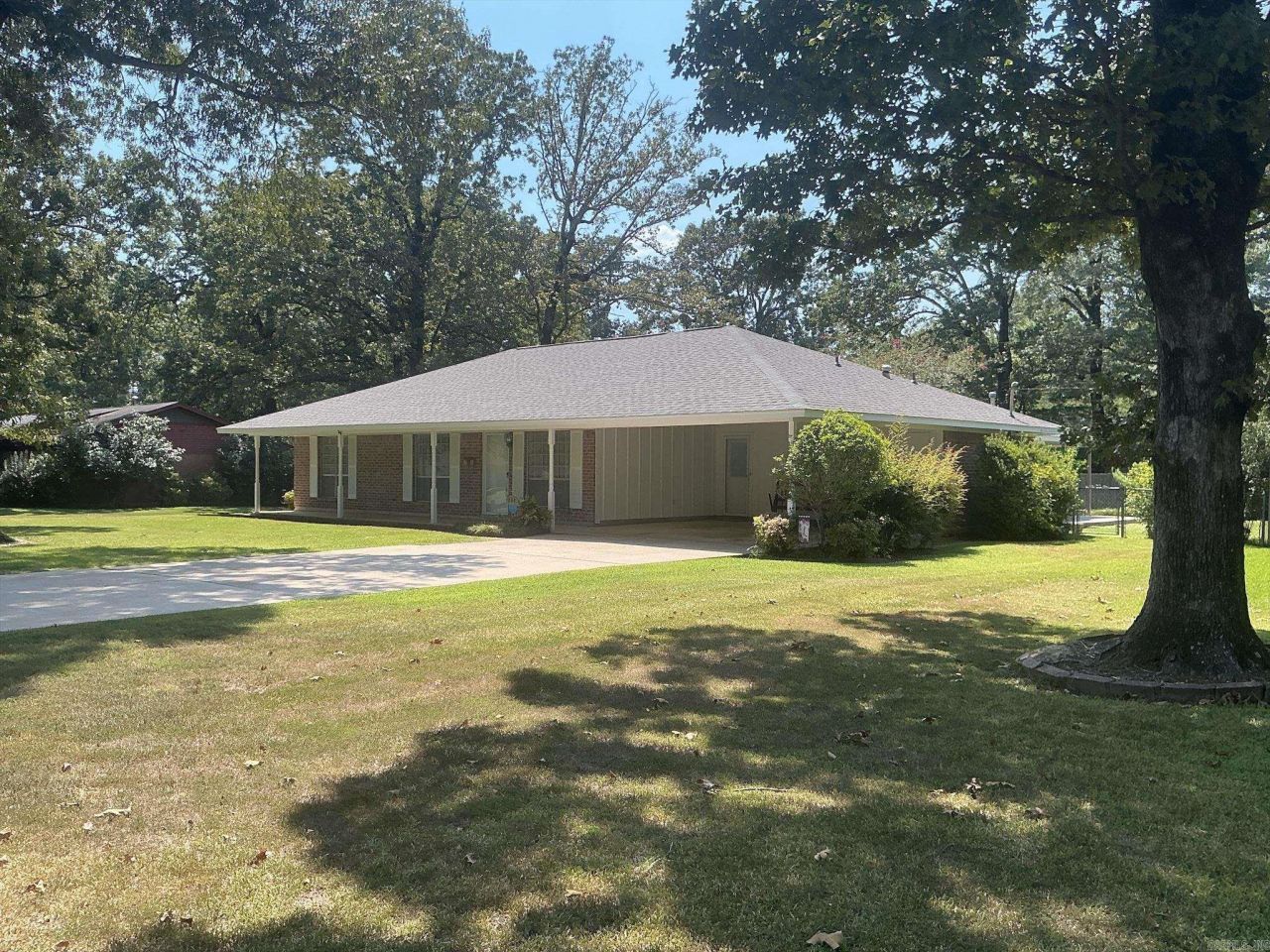 This beautiful move-in-ready home features sitting on a large lot has a wonderful floor plan with a large formal living room, formal dining room with built-ins, large den (640 sq ft) with fireplace and built-ins, backdoor leading to the covered patio and large backyard, kitchen with double ovens, dishwasher, refrigerator, and small breakfast area with double doors leading to the formal dining room, laundry room with storage over w/d, tile floors in kitchen and laundry room, luxury vinyl is in the den, formal dining room and hall, three bedrooms with carpet, large closets, two full baths, hall bath with shower over bathtub, and the master bath also with shower over bathtub. Home also features beautiful curb appeal, a double carport with concrete driveway, outside storage building, privacy fence in the backyard and cyclone fence in front, covered patio and side porch also. The central unit is gas heat, 2005, hot water heater gas and a new Architectural roof, August 2025. Property is located within walking distance to Anderson School and park with the exercise equipment. This home is one you must see to know all the amenities.