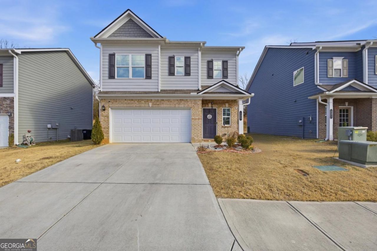 Stunning 2022-built home in the desirable Waterside Ridge community offering 3 bedrooms, 2.5 bathrooms, and an upstairs loft in like-new condition. This modern home features an impressive open-concept main level with a chef-inspired kitchen showcasing rich wood cabinetry, granite countertops, large island with breakfast bar seating, stainless steel appliances, and stylish modern pendant lighting. The spacious living room is the showstopper of this home with its dramatic floor-to-ceiling fireplace featuring a striking vertical wood slat accent wall, soaring vaulted ceilings, and oversized windows that flood the space with natural light. Updated designer light fixtures throughout add contemporary elegance. The main level includes durable tile flooring and a convenient half bath with a granite vanity. Upstairs, you'll find three well-appointed bedrooms, two full bathrooms with granite countertops and modern fixtures, plus a versatile loft space perfect for a media room, home office, playroom, or second living area. Comfort is enhanced with upgraded ceiling fans featuring decorative elements. Outdoor living is exceptional with two covered patio areas ideal for entertaining - the main patio features elegant columns providing the perfect setting for year-round enjoyment. The fully fenced backyard offers privacy and backs to a tranquil natural area, perfect for families and pets. Additional features include a two-car garage and move-in-ready condition throughout. Don't miss this opportunity to own a nearly new home with modern finishes in an established neighborhood!