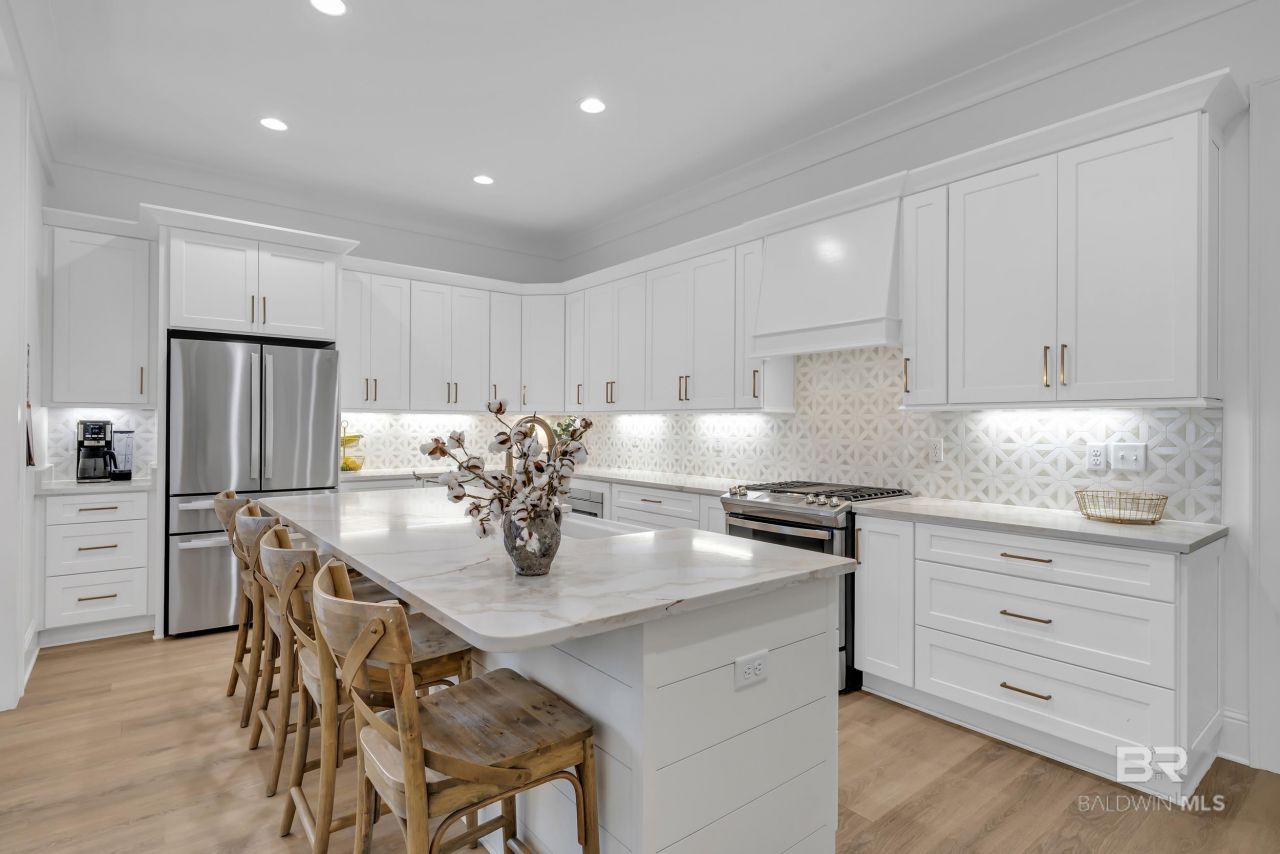 Welcome to easy coastal living in this custom built, GOLD FORTIFIED, single-story home, just minutes from the beach. Designed for comfort and low-maintenance living, this home features 10-foot ceilings throughout, solid wood 8-foot doors, crown molding, shiplap accents, plantation shutters and abundant natural light.The kitchen delivers the the wow factor with quartz countertops, beautiful backsplash, hood vent and a large kitchen island. The GAS range and large walk in pantry add function and convenience. The 3 bathrooms also have quartz countertops, fully tiled showers, and elegant gold fixtures.Relax on the screened-in back porch and enjoy the coastal breeze, or take advantage of the neighborhood's newly built community pool. Just outside the entrance to the neighborhood is the Fort Morgan bike path which offers miles of scenic riding and walking (with planned expansion all the way down Fort Morgan) making it easy to enjoy morning bike rides, sunset strolls, and everything the area has to offer. Built with a metal roof, seamless gutters, and a generator plug for added peace of mind, this home offers the perfect setting to slow down, unwind, and enjoy the next chapter near the water. Seller is a licensed realtor in the state of Alabama. Buyer to verify all information during due diligence.