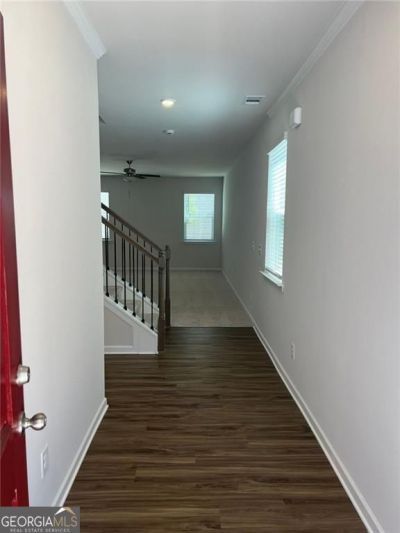 This 3 Bedroom, 2.5 Bath home with stone across front floor, front porch and 2 car rear entry garage. Kitchen with 36-inch-stained cabinets, island, granite counter tops, LED lighting, and LVP flooring extending into the dining area. Open concept with cozy family room featuring carpet. Walk in pantry, large coat closet and a half bath with second entrance to back yard . Rear stairs to 2nd floor featuring huge Master bedroom with trey ceiling and windows for natural light. Master bath has a 5 ft. shower, double bowl raise height vanity with cultured marble, linen close, walk in closet, and separate water closet. 2 additional bedrooms, full bath and laundry closet complete this charming home. The location is the best feature of this community. Less than a mile from SR 400, close to the Outlet Mall, restaurants and shopping.
