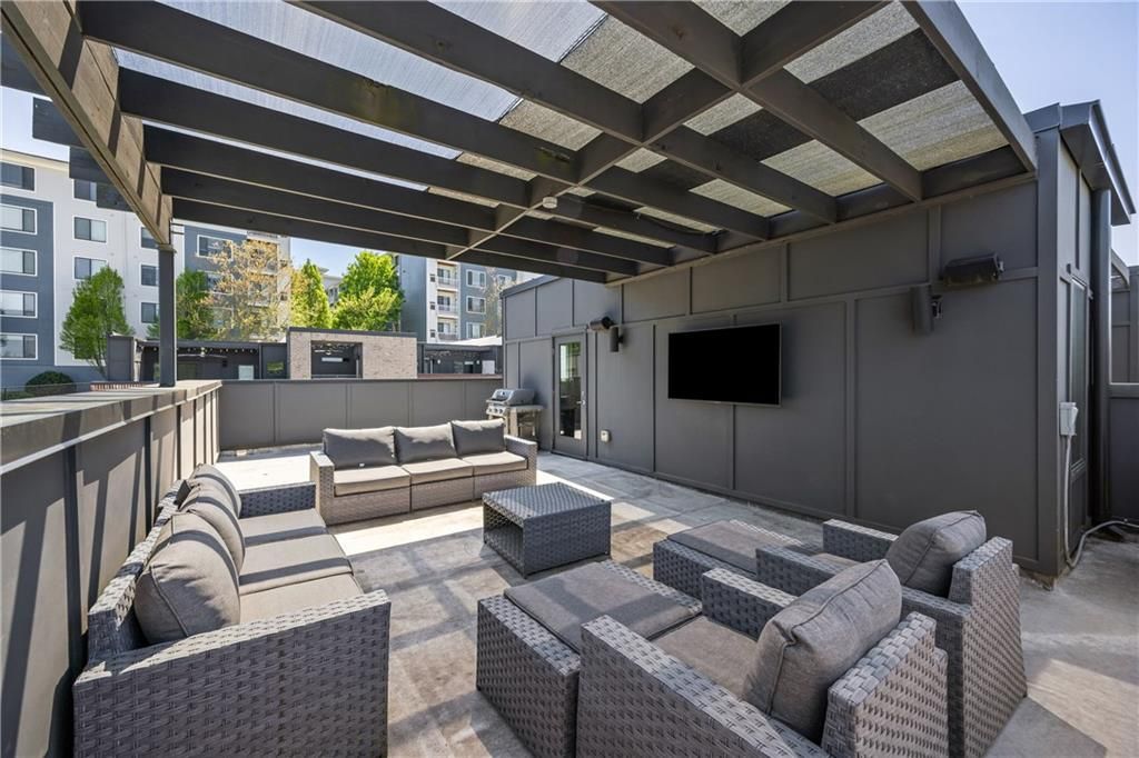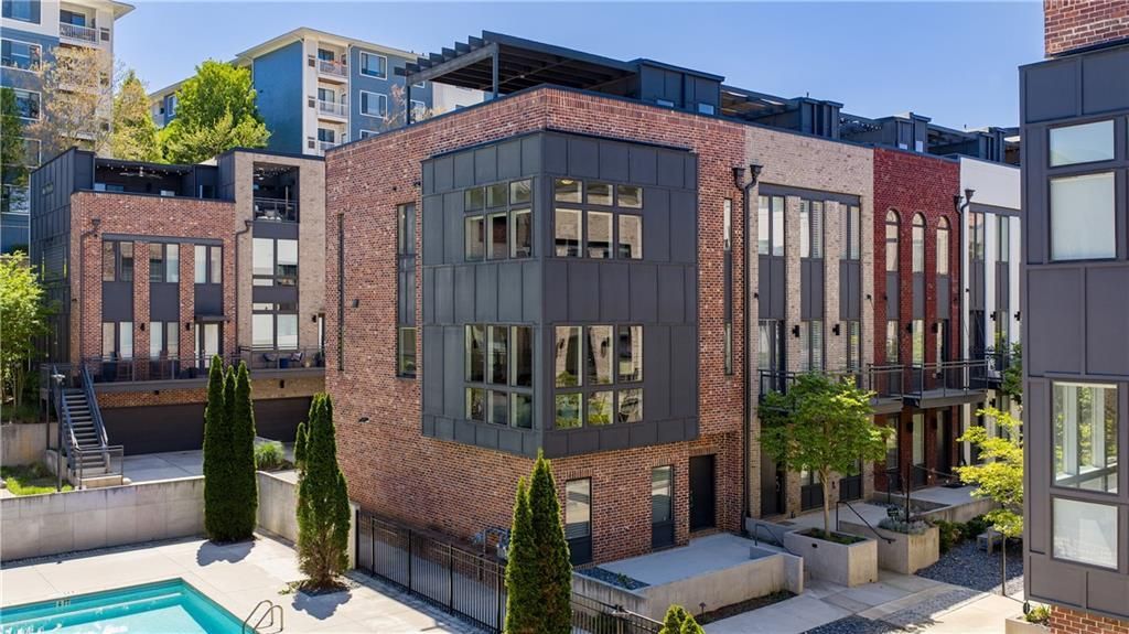 Bathed in natural light and positioned as a coveted end unit, this striking modern townhouse offers a level of finish and livability rarely achieved?perfectly sited adjacent to the community pool for effortless access to resort-style amenities. The main living level unfolds in a seamless open-concept design, framed by three walls of windows that flood the interiors with light. A stunning chef's kitchen anchors the space, featuring waterfall-edge quartz countertops, sleek contemporary cabinetry, and a full suite of professional-grade stainless steel appliances. An oversized island with generous seating serves as both a functional workspace and social centerpiece. The kitchen flows effortlessly into a refined dining area accented by designer lighting, and onward to a spacious fireside family room defined by a modern fireplace and expansive walls of glass. Upstairs, the primary suite is thoughtfully designed as a private retreat, complete with a custom walk-in closet and a spa-inspired bath featuring dual vanities and a frameless glass walk-in shower. A secondary ensuite bedroom, equally well-appointed and filled with natural light, along with a dedicated laundry room, completes the upper level. The top floor elevates the home's lifestyle appeal with a wet bar and wine refrigerator, seamlessly servicing the expansive rooftop terrace?an exceptional outdoor living environment. Designed for both relaxation and entertaining, the terrace features a grilling station, outdoor television, pergola-covered lounge, and integrated speakers, offering a true extension of the interior living space. The finished terrace level provides additional flexibility with a third ensuite bedroom?currently configured as a media room?alongside access to the attached two-car garage. Ideally located within walking distance to Westside Market, Topgolf, Star Provisions, The Works, and the PATH trail system, this residence delivers a rare combination of modern design, abundant natural light, and unparalleled access to one of Atlanta's most dynamic lifestyle corridors.