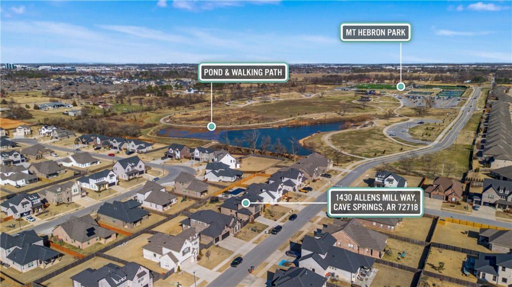This extremely walkable Bentonville school zoned home is 2 minutes from Mt. Hebron Park on foot (voted one of the best parks in NWA) and 1 minute to the school bus stop. The convenient location of this home often has us saying, Anything we want is 20 minutes away or less. The split floor plan delivers privacy with the primary suite downstairs on the opposite side from three upstairs bedrooms. 10' ceilings down and 9' up create an airy, elevated feel. The oversized kitchen island opens to the great room. Downstairs office with large built-in closet sits beside the half bath for flexible use. Upstairs features a spacious bonus room plus a bedroom with ensuite bath. Every bedroom includes a walk-in closet. Natural gas powers the fireplace, stove, dual HVAC, tankless water heater (endless hot water) and the covered back porch is plumbed for gas heat or cooking. A full fenced in backyard and a two-car garage with bump-out complete this move-in ready home in one of Arkansas's most desired areas. Agent Owned.