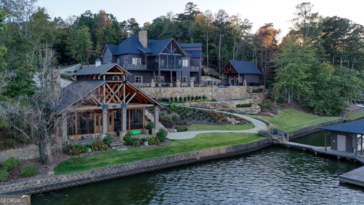 Welcome to this stunning custom-built home perfectly situated on beautiful Weiss Lake, offering breathtaking views of both the lake and the mountains. Every detail of this property reflects luxury, comfort, and exceptional craftsmanship, creating the ultimate retreat for family living and entertaining. Designed with an open floor plan, the main level welcomes you with an inviting foyer, a formal dining room, and a spacious family room with a fireplace and expansive lake views. The gourmet kitchen is a chef's dream, featuring top-of-the-line appliances, custom cabinetry, and a hidden butler's pantry with additional kitchen appliances. A large screened porch overlooking the lake provides the perfect setting for morning coffee or evening gatherings. The luxurious owner's suite offers panoramic lake views, large his-and-her closets, and a stunning ensuite bath with custom tile, double vanities, and a soaking tub. Two additional bedrooms, each with ensuite baths and walk-in closets, along with a convenient laundry room and a half bath for guests, complete the main floor. Upstairs, you'll find two additional bedrooms with a shared bath and walk-in closets, plus unfinished spaces perfect for storage or future expansion-offering plenty of room and privacy for family or guests. The terrace level is designed for entertainment and relaxation, opening directly to the spectacular pool area. This level includes two ensuite bedrooms with walk-in closets, a half bath for guests, a second laundry room, and a spacious recreation room with a game area and large bar. There's also a home theater, office (or optional bedroom), hobby or game room ( or additional bedroom), a secure safe room, a wine cellar, and a walk-in vault. Every detail has been carefully planned with premium wood and stone flooring, custom finishes, and elegant architectural touches throughout. Step outside and experience true resort-style living. The outdoor oasis features a Gunnite and Pebble Tec heated pool and hot tub flanked with fire bowls, an infinity-edge waterfall flowing into a lower pool with bar stools overlooking the lake, and a fire pit for cozy lakeside evenings. A putting green adds a fun touch for guests and golf enthusiasts alike. The pool house offers even more convenience with a half bath, changing room, and an unfinished sauna-perfect for relaxing after a swim. The screened lakeside pavilion is an entertainer's dream, complete with stainless-steel Lynx appliances including a grill and griddle, an open dining area, and a cozy sitting area with a beautiful stone fireplace. A half bath and large storage area make this space ideal for lakeside gatherings. The boat dock offers 3 covered boat slips with complete with lifts and a large open area for fun in the sun. For vehicle and storage needs, the property features a 3-car attached garage plus an additional 36' x 65' detached garage-perfect for boats, RVs, or additional storage. The property also includes a dog kennel, abundant parking for family and guests, and is completely fenced with a keypad entry gate for privacy and security. From the moment you arrive, you'll appreciate the thoughtful design, high-end finishes, and attention to detail that make this property truly one of a kind. This extraordinary Weiss Lake estate combines elegance, recreation, and natural beauty into one perfect lakefront home.