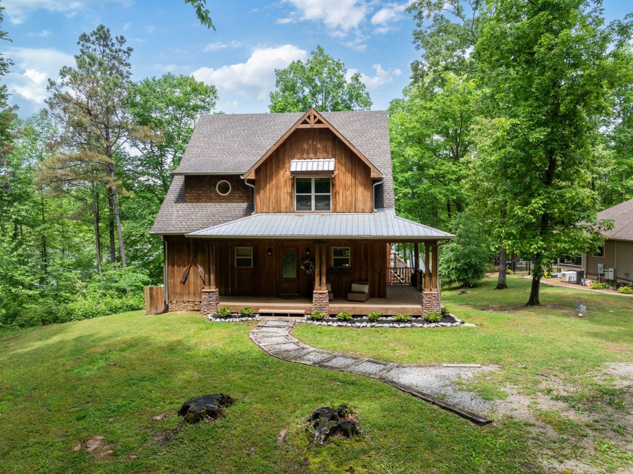 Custom lakefront home in the gated Indian Lake community. There are beautiful views of the lake from almost every room in the house. The open living area leads out to the covered back deck which sets up perfectly for entertaining. There are so many custom details in this home, it's just too many to list. The primary suite is on the main level, making it easily accessible for anyone. Upstairs has a bedroom, full bathroom & nice loft overlooking the living room for a great place to curl up with your favorite book. The basement has a bedroom, safe room & a recreation room with a pool table. Walk out of the basement to the covered back patio with a hot tub that overlooks the lake. For the avid fisherman, Indian Lake is a professionally managed lake that's endorsed by Jimmy Houston. This home is a must see because pictures just don't do it justice. New private dock & boardwalk installed September 2025.