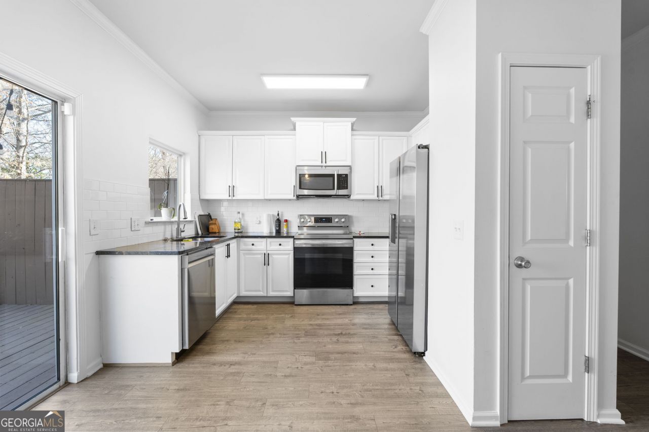 Welcome to this beautifully updated townhome in the highly sought-after Liberty Park community - offering modern finishes, functional space, and exceptional convenience within a 24-hour guard-gated neighborhood. Step inside to an open and inviting main level designed for both everyday living and effortless entertaining. The spacious living and dining areas flow seamlessly together, while a convenient powder room adds practicality for guests. The renovated kitchen features crisp white cabinetry, granite countertops, subway tile backsplash, and stainless-steel appliances. Just off the kitchen, a generously sized private deck provides the perfect setting for morning coffee or evening relaxation. Upstairs, the primary suite offers a peaceful retreat with abundant natural light, an ensuite bath, and ample closet space. A spacious secondary bedroom with its own private bath is ideal for guests, roommates, or family members. The laundry area is also conveniently located on this level. The terrace level adds valuable flexibility with an additional bedroom featuring custom built-in shelving and bookcases - perfect for a home office, media room, gym, or guest suite. Liberty Park residents enjoy premier amenities including a swimming pool, dog park, and 24-hour guard-gated security. Ideally located with easy access to I-285 and I-75, the home is just minutes from Publix, local dining, shopping, and the popular Westside Park. A rare opportunity to own a move-in ready home in one of Atlanta's most desirable gated communities.
