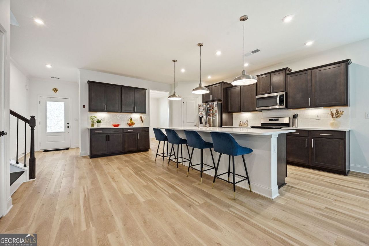 Privately owned resale home - not builder inventory or new construction. This completed 2024 Berkeley Mill property is offered as a short sale subject to lender approval and features extensive upgrades throughout...Available now and offered in like-new condition, this home has been upgraded to the fullest extent offered for this floor plan. Hardwood floors run throughout the home, complementing oversized rooms and a functional main-level layout with a true formal dining room. The open living area features a corner fireplace with a painted brick surround and custom mantel, while oak tread stairs with open railing and metal balusters add architectural interest. The kitchen is designed for both style and everyday use, featuring upgraded cabinetry with soft-close doors and drawers, roll-out trays, quartz countertops, an extended island overhang, designer tile backsplash, under-cabinet lighting, and a direct-vent hood.Upstairs, the spacious owner's suite includes tray ceilings and a spa-inspired bathroom with a walk-in shower, separate soaking tub, upgraded tile surrounds, quartz countertops, and modern fixtures. Secondary bedrooms are generously sized, with walk-in closets in every bedroom except the fourth. A large loft offers flexible space for a media room, home office, or additional living area. Additional upgrades include a covered lanai and extended patio, enhanced LED lighting throughout, upgraded trim and baseboards, two-tone interior paint, faux wood blinds, upper laundry cabinetry, a painted garage, EV charging outlet, smart home features, and upgraded door hardware. Berkeley Mill offers resort-style amenities including a pool with cabanas, playground, walking trails, and a neighborhood fire pit. Conveniently located near GA-400, Cumming City Center, and Lake Lanier, this home combines modern design, high-end upgrades, and immediate availability.