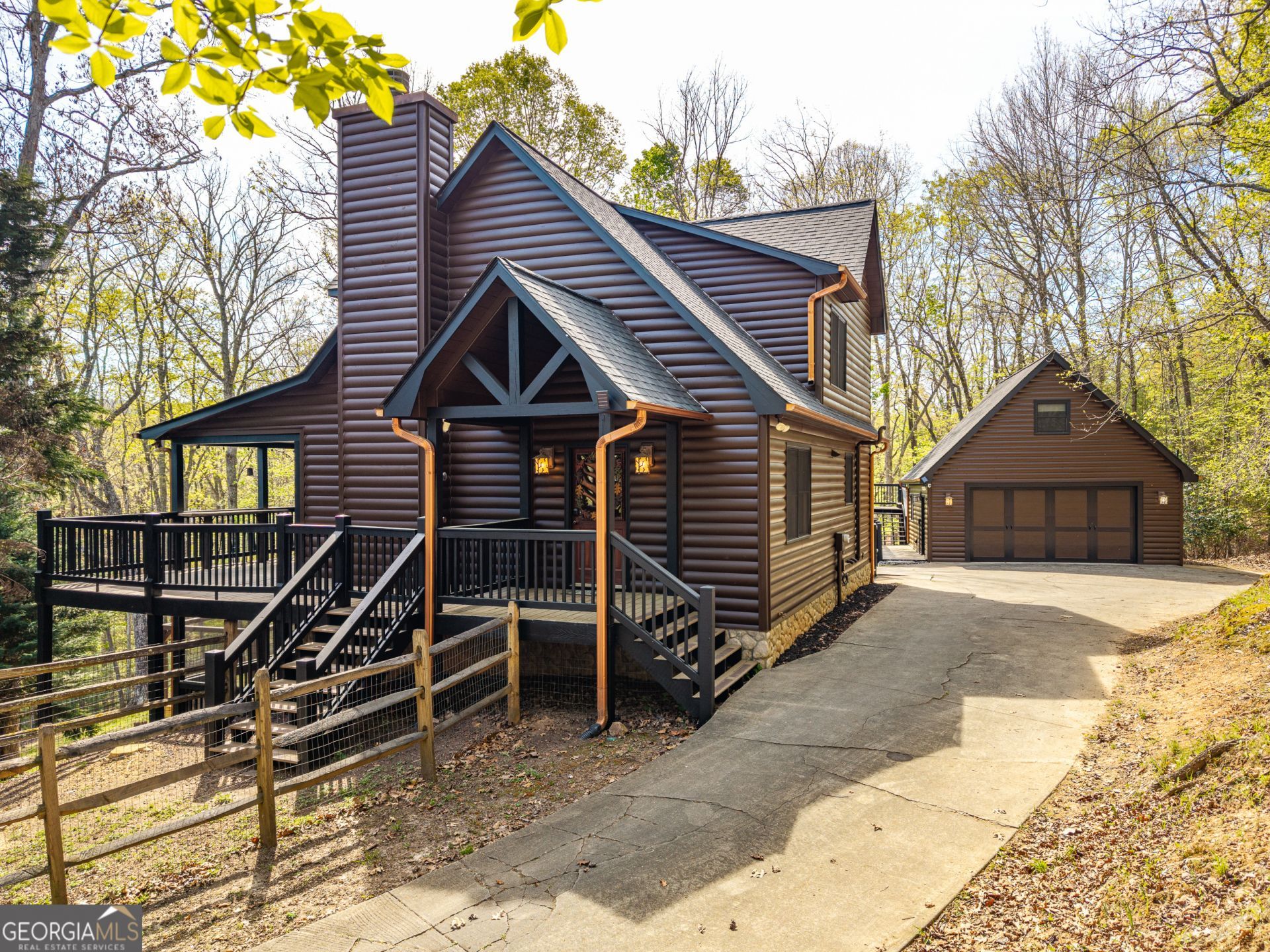 Conveniently located in a gated community just minutes from Highway 515 and a short drive to both Blue Ridge and Blairsville, this property is perfectly positioned for easy access to everything the area has to offer. The main cabin impresses from the moment you step inside, with soaring cathedral ceilings and a striking stone fireplace anchoring the spacious, open living area. The large, updated kitchen, complete with modern finishes and an adjoining dining space, is perfect for hosting family and friends. With three bedrooms + sleeping loft, and three full bathrooms, there's plenty of room to accommodate everyone in comfort. The master suite is a true sanctuary, featuring a private, screened balcony and ensuite bath with a jetted tub and tiled shower. Need extra space for guests or additional rental income? The detached two-car garage includes a private guest suite with its own fireplace, bathroom and spacious deck, providing flexibility and added value. The entertainment options are endless! The fully finished terrace level is an entertainer's dream, offering a wet bar, arcade games, and a large lounge area for unforgettable gatherings. Step outside, and you'll find even more to love. Wraparound decks, a bubbling hot tub, fire pit with swings, and a charming porch invite you to relax and soak in the serene mountain views. The fully fenced yard is perfect for kids or pets to play while you unwind. With a brand new 2026 architectural shingle roof and whole-house freshly stained (including all decks), this property is fully furnished, move-in ready and built for years of enjoyment whether you are looking for a full time residence, personal getaway or an income-producing vacation rental.