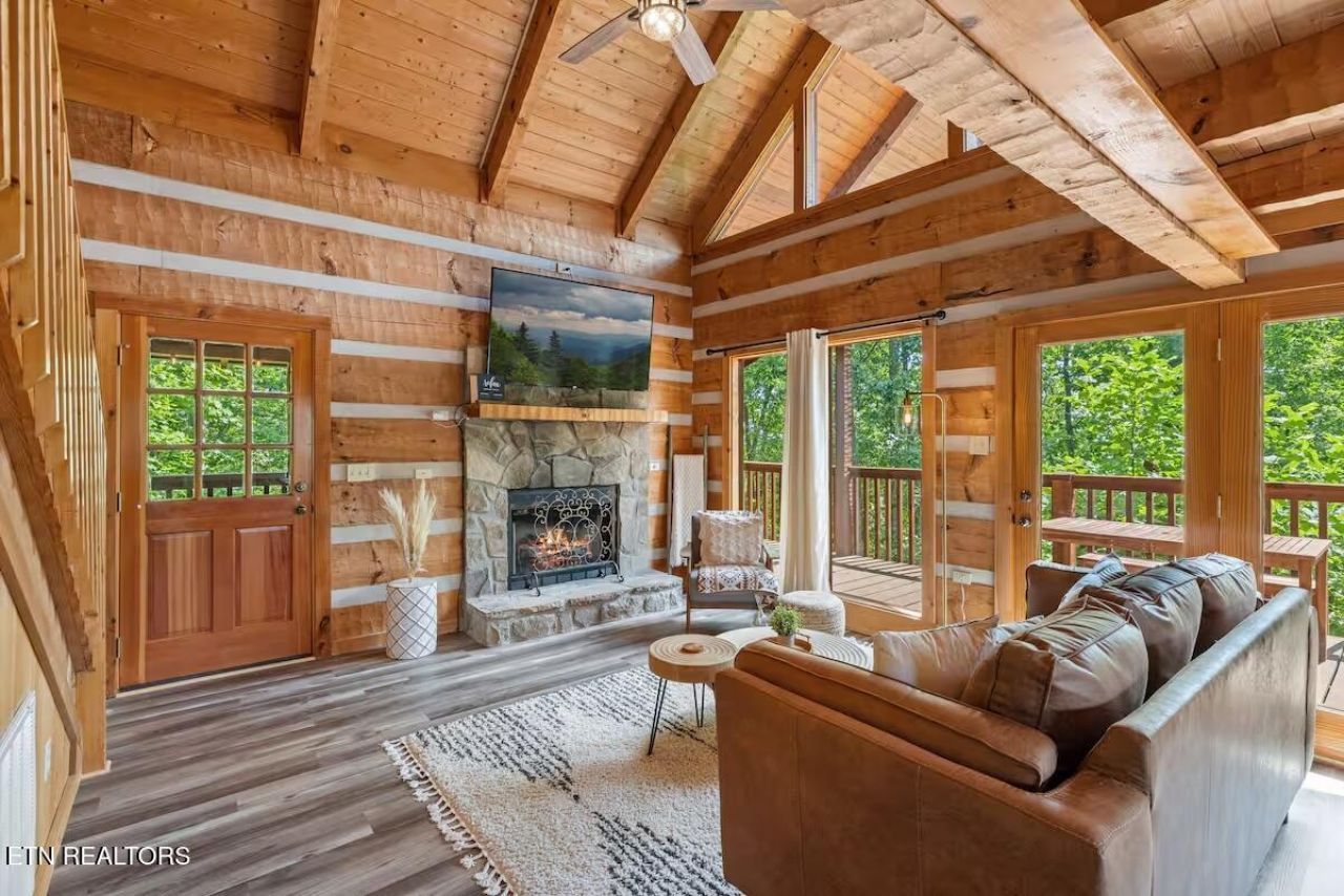 Bear View Cabin - Smoky Mountain Retreat & STR Investment OpportunityEnjoy breathtaking mountain views from this cozy cabin featuring a wrap-around porch, outdoor bar, hot tub, and plenty of parking. Located in the heart of the Smoky Mountains, this ~1,250 sq. ft. home offers a perfect blend of rustic charm and modern comfort-making it an ideal short-term rental investment.The open-concept living area boasts a vaulted wood-beam ceiling, stone fireplace, and walls of windows showcasing the surrounding forest. The fully equipped kitchen includes bar seating and a dining area with mountain views.Primary suite with king bed and ensuite bath upstairs; second king bedroom and hall bath on the main level; loft bedroom with two twin beds, trundles, workspace, and game area. Each bedroom has its own Smart TV.Relax on the porch swing, in cozy egg chairs, or in the hot tub under string lights. Convenient to area attractions yet offers a peaceful mountain escape-perfect for guests and owners alike.