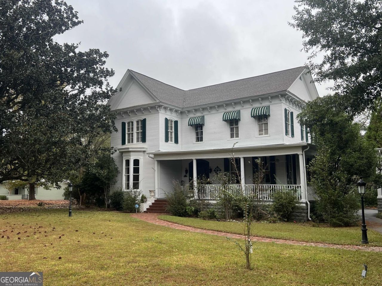 Step into timeless elegance in this beautifully preserved 1870 home where historic grandeur meets modern luxury. Highland View was built by the Shorter family - of Shorter Mansion. As you step onto the wrap-around porch & enter the grand foyer, you'll be left breathless by the black walnut staircase, transported from Philadelphia & rumored to be the widest staircase in town. The soaring 13' ceilings crown expansive rooms, creating an airy, light-filled atmosphere rarely found today. The floor-to-ceiling pocket door transitions between the living & dining room, offering both architectural drama & flexible entertaining flow. There is a sunroom nook off of the dining room, filled with natural light. Period details blend seamlessly with thoughtful updates, honoring the home's heritage while supporting contemporary living. Each room features original hardwood floors & decorative fireplaces. There is a master suite on each level of the home; two upstairs bedrooms share a bathroom. The family room features a fireplace & wall of windows overlooking the screened porch, as well as a private oasis w/gunite pool, white picket fence, garden shed, & koi pond, all framed by mature landscaping-perfect for quiet afternoons or elegant outdoor gatherings. This remarkable home is a rare opportunity to own a piece of history, distinguished by scale, craftsmanship, & enduring character, all complemented by modern comforts designed for today's lifestyle. Just over a mile to downtown Eufaula.