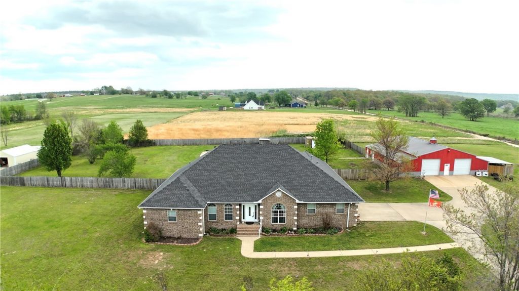 Beautiful custom brick home on 5.7 acres just minutes from town! A concrete drive leads past newly planted pecan, apple, peach & plum trees to the home & 60x60 shop. Offering 3,144 sq ft, this home features 3 bedrooms, 3.5 baths?each bedroom with a private bath?plus a large office with built-ins, a music/game room or 2nd office, & a second living area or 4th bedroom. Semi-open, split bd floor plan. Kitchen includes granite, an island workspace, gas range, double wall ovens, & huge pantry with garage access. Sewing room off the oversized utility room. Oversized bedrooms with walk-in closets. Hand-scraped hardwood & tile flooring. In-line propane water heater(6-yr). In-ground saltwater pool (4-yr liner, 2-yr cover) in privacy-fenced yard. Brick 10x16 storm shelter with electric. Shop includes 20x25 lean-to & 1,200 sq ft 1 bed/1 bath apartment-ideal for multi-generational living, in-law quarters, guests, or rental income. 17 mi to U of A in Fayetteville, 9 mi to Siloam Springs, & 15 mi to I-49.