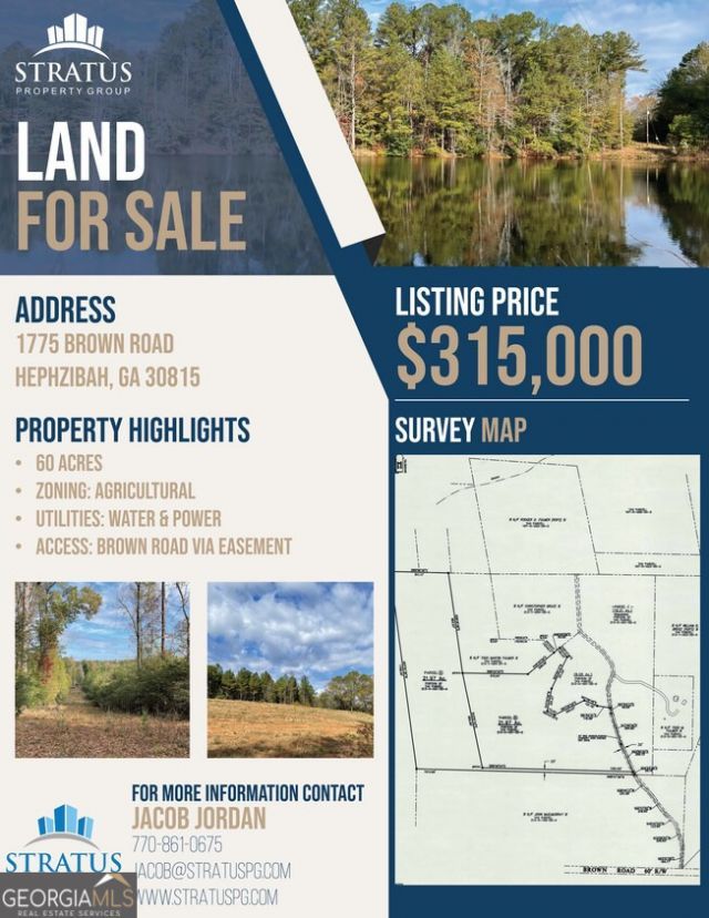 1775 Brown Rd, an exceptional 59.99-acre property in Hephzibah, GA, featuring a 6-acre pond. This undeveloped tract offers a prime opportunity for either a private estate or a small residential development. With a rural setting surrounded by mature old-growth hardwoods, this property provides a natural landscape that's perfect for creating a private estate or several estate-sized lots. Accessed via easement from Brown Rd, the property offers ample space and privacy, while utilities are conveniently located at the road, ready to be brought onto the site. The lush, wooded surroundings offer the perfect setting for outdoor activities. Whether you're seeking an exclusive, secluded retreat or looking to develop a unique residential community, this land is a rare find with tremendous potential.