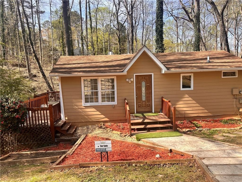 Check out this cozy and charming home. This 2 bd/1ba open concept home has lots of natural light makes the main room spacious with high ceiling, kitchen, dining, has a large side deck perfect for morning coffee and unwind after work on your private backyard and peaceful setting. The finished basement has so much potential with cozy natural wood fireplace and another side covered/screened patio to enjoy all season long. Home is tucked away yet convenient to shopping, dining, parks, Lake Lanier, hospital and main roads. Don't miss this opportunity to make this wonderful home your own!