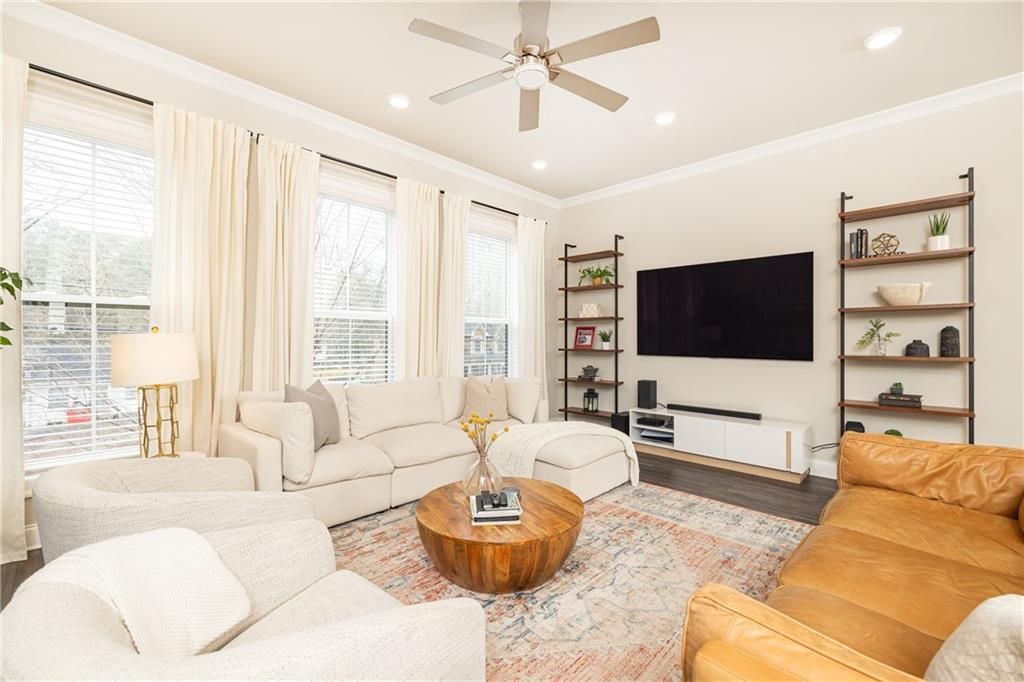 Rare end-unit townhome in the heart of the Upper Westside, just steps from the shops and restaurants of Westside Village. This thoughtfully designed home offers an open-concept layout with hardwood floors, high ceilings, and abundant natural light throughout the main living spaces. The kitchen is both stylish and functional, featuring stainless steel appliances, white cabinetry, quartz countertops, and a large island that overlooks the dining and living areas, perfect for entertaining or everyday living. Upstairs, the spacious owner's suite offers a quiet retreat with a spa-like bathroom that includes a large frameless shower and dual vanities with Piedra Fina countertops. The upper level also features a second bedroom with its own private bath, along with a conveniently located laundry area. The terrace level provides additional flexibility with a third bedroom and en-suite bathroom, ideal for guests, a home office, or workout space. A two-car garage adds extra convenience and storage. Enjoy a true live-work-play lifestyle with easy access to the shops, restaurants, and fitness options at Westside Village, along with nearby trails and paths that connect to surrounding neighborhoods. With its prime location and comfortable, well-designed layout, this Upper Westside townhome is a fantastic opportunity for intown living.