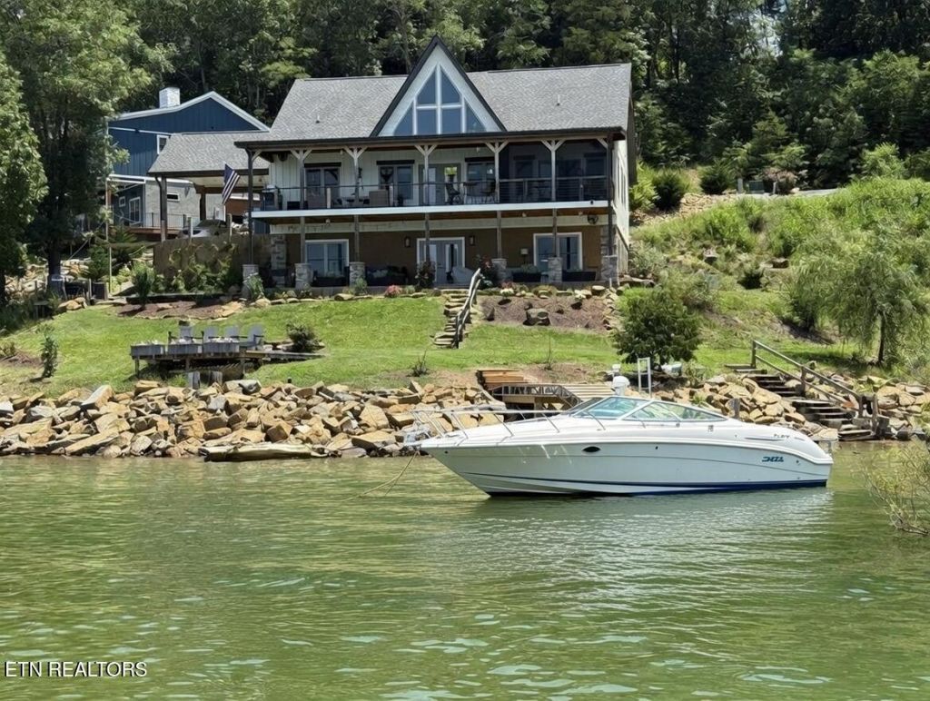 Luxury Living in an exclusive gated community with lake views from every bedroom! This beautiful timber frame home is set on prime deep, year-round water, this extraordinary 5 bedroom, 3 bath lakefront estate offers a rare combination of architectural presence, panoramic views, and income versatility. Designed for those who expect more than just a waterfront home, this property delivers an elevated lifestyle experience from every angle. Experience refined living and effortless entertaining, this rare lakefront retreat offers the ultimate blend of elegance, comfort, and versatility. From the moment you enter, expansive windows frame shimmering water views, flooding the home with natural light. The thoughtfully designed layout features two full kitchens, creating an ideal setup for multi-generational living, luxury short-term rental potential, or seamless hosting on a grand scale. The primary living spaces flow beautifully to multiple outdoor living areas, where sunrise coffee and sunset gatherings become daily rituals. Whether relaxing beneath covered lounging spaces, dining al fresco with the lake as your backdrop, or rinsing off in the private outdoor shower after a day on the water, every detail was curated for the lakefront lifestyle. The spacious five-bedroom design ensures privacy for family and guests alike, while the three well-appointed baths provide both style and function. Step outside to your deep-water access ~ perfect for boating, swimming, paddle boarding, or simply soaking in the breath taking views! This property is more than a home ~ it is a statement property offering a rare opportunity to own a luxury lakefront retreat where every day feels like a vacation.