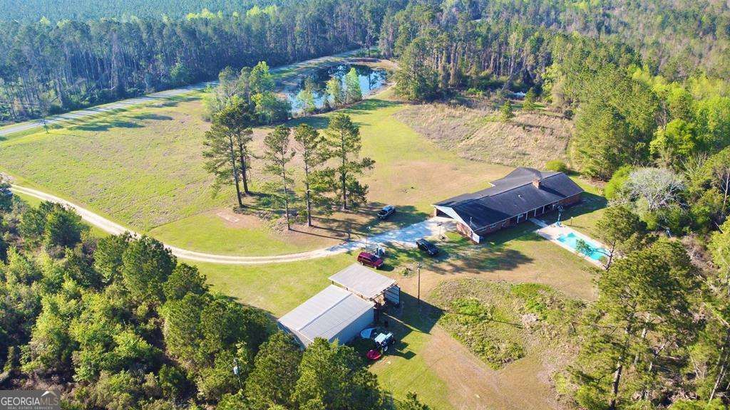 Experience peaceful country living on this beautiful 10-acre property featuring a spacious home offering 3,710 sq ft of living space with 4 bedrooms and 3 baths, plus two additional versatile rooms ideal for bedrooms, offices, guest space, or bonus areas. Enjoy outdoor living with a large yard, in-ground saltwater pool, stocked pond with a small dock, deep well, double carport, 32x20 RV parking shelter, and a 3040 metal building perfect for a garage, workshop, or storage. Inside, generous living areas offer relaxing views of the yard, pond and pool. The primary suite includes a large bedroom, dual vanities, a private water closet with shower, and both walk-in and additional closet space. This tranquil property offers comfort, space, and functionality. Don't miss this spacious Southern retreat. Property is enrolled in a 10-year tax saving agricultural covenant to be assumed by buyer.