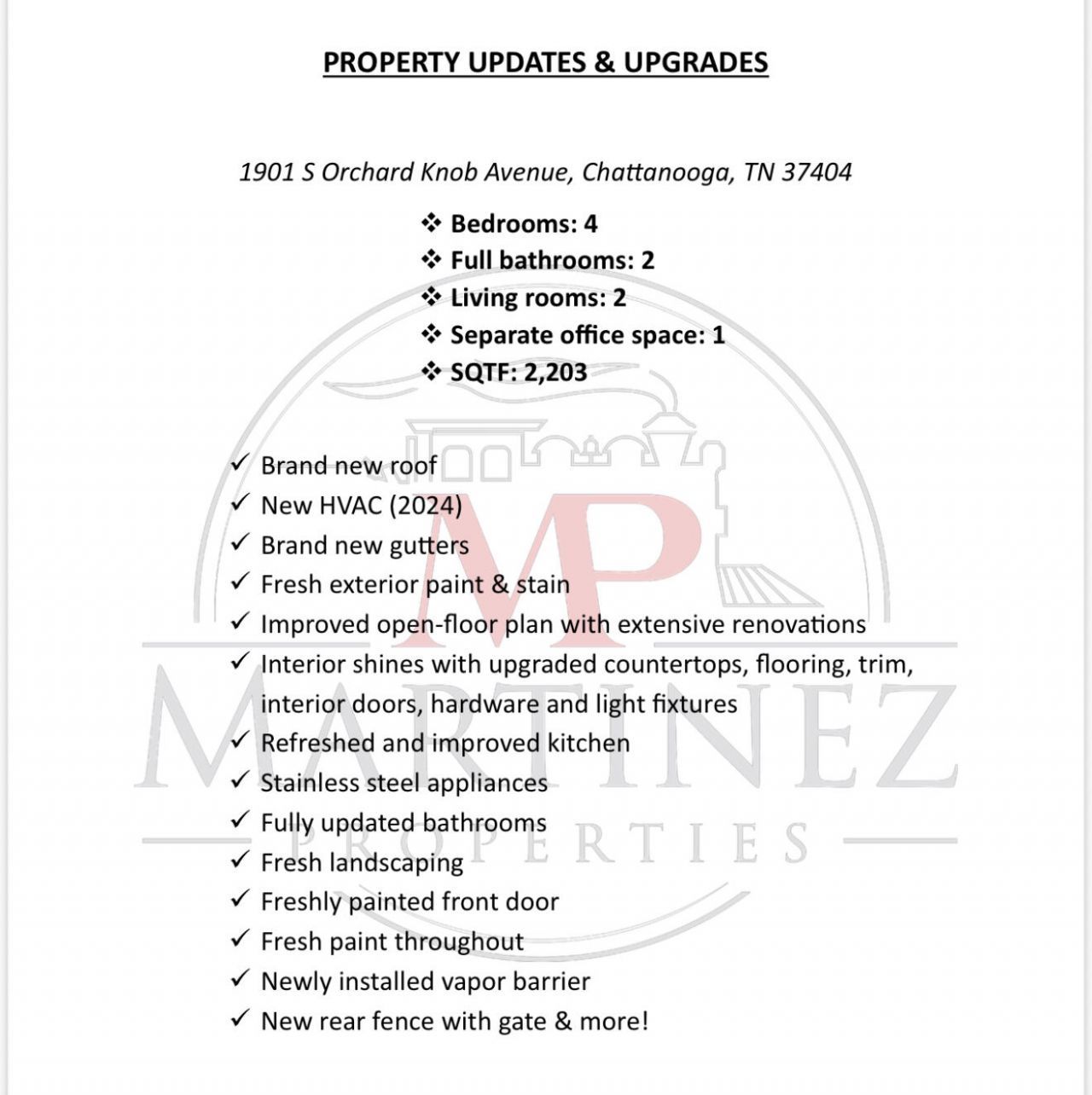 Your longing for an UPDATED ONE LEVEL corner lot home with easy access to all that Downtown Chattanooga has to offer is over! Welcome to 1901 S Orchard Knob Avenue, located just one block away from two green spaces?Henriette and Lynnbrook Parks?a stone's throw from the sought-after Highland Park area, and only 1.5 miles from the vibrant Southside, where you can enjoy fantastic culinary options such as Alleia, State of Confusion, Bluegrass Grill, Oddstory Brewing Co. and more!Upon arrival, you'll notice an array of updates, including a brand-new roof, gutters, HVAC (2024), exterior paint, rear fence, and landscaping, as well as an updated interior featuring 4 bedrooms, 2 full baths, 2 living rooms, and even an additional room ideal for a home office or storage space.The freshly painted and stained front porch extends the entire length of the home and easily accommodates rocking chairs, a swing bench, or both. Inside, you'll enjoy updated hardwood-style flooring throughout. The foyer offers direct access to the first of four bedrooms and a front room perfect for a home office, craft room, or storage. The first living room, located just past the foyer, features a large lighted ceiling fan with remote control settings, creating a relaxing space to unwind.The refreshed kitchen offers stainless steel appliances, new hardware, and a double window above the sink for added natural light. This functional kitchen also includes a dining area, which leads to three additional bedrooms down the hallway. The primary bedroom, located at the rear of the home for added privacy, offers a fully updated ensuite bathroom featuring an upgraded vanity, commode, shower/tub combo, fixtures and hardware. Two additional bedrooms share another fully updated full bathroom, conveniently located off the hallway next to a spacious laundry room. Last but not least, you'll find a secondary living space that can serve as a media room, homeschool classroom, or bonus room for hosting guests. There's even a large linen closet right outside this flexible area. Other updates include a freshly stained back deck, overseeded backyard, new vapor barrier and more!Buyer to verify any items deemed important, including but not limited to school zones, square footage, and taxes. Call TODAY to schedule your private tour!