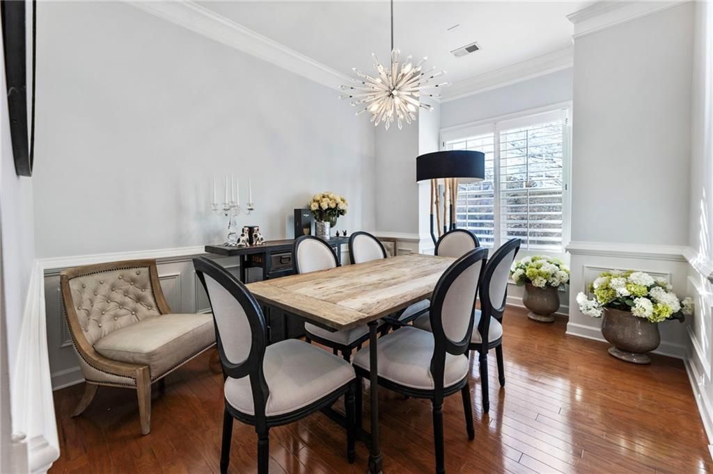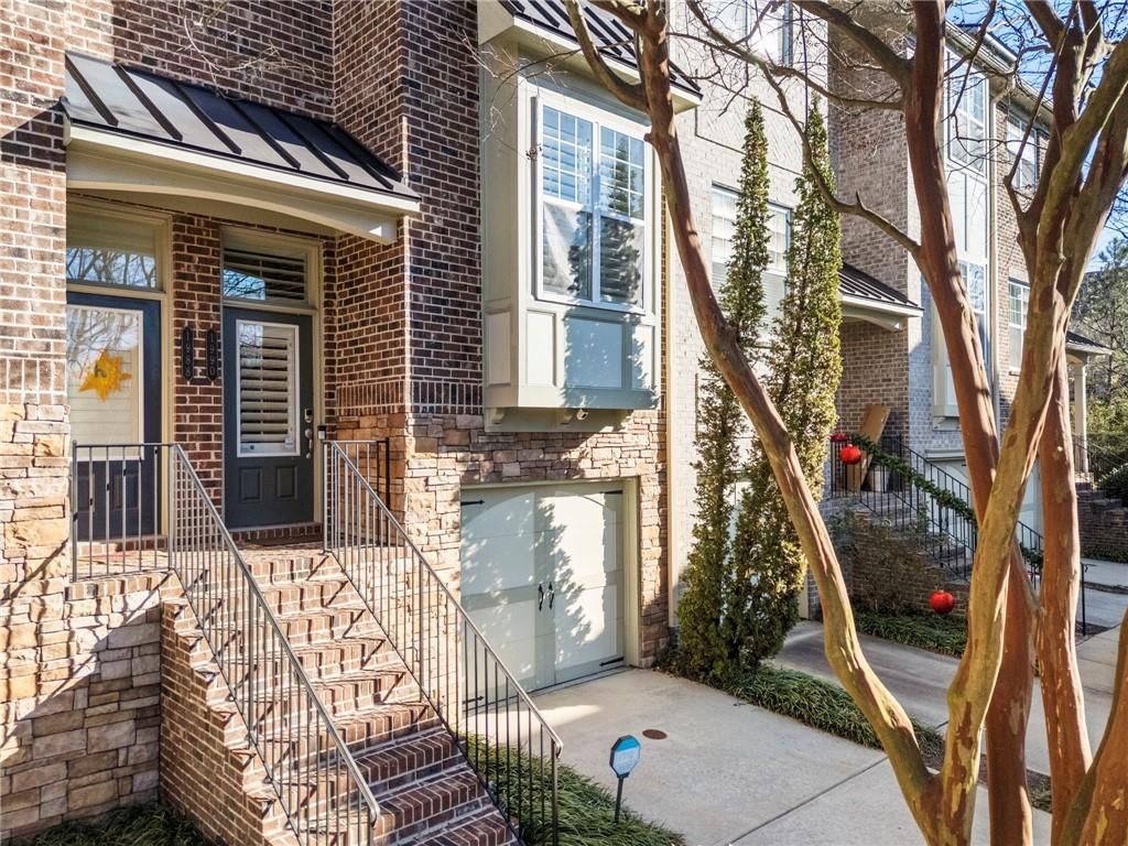 Set within the sought-after + gated Cobblestone at Brookhaven community, this well-appointed townhome offers comfort, privacy and thoughtful design. Wood floors define the main level, where a bright dining room with wainscoting and plantation shutters flows into a kitchen featuring white cabinetry, granite countertops, a classic subway tile backsplash, stainless steel appliances and oversized crown. The living room opens to a private deck overlooking a peaceful, tree-lined setting. Upstairs, hardwood floors and wrought-iron balusters lead to the primary suite with a tray ceiling and a luxurious bathroom. Enjoy a double vanity, a frameless glass shower, a separate soaking bathtub and a custom walk-in closet. Also on the upper level is a versatile bonus room, ideal as a third bedroom or office, with glass French doors and plantation shutters. The hardwood floors continue on the lower level, which offers a private bedroom with an en suite bathroom and a covered walkout patio. A one-car garage with storage and an extended driveway accommodating up to three vehicles provides rare parking flexibility. The gated community features serene green spaces, a pool, and a butterfly garden and is conveniently located near parks, shopping, greenways and schools. Upgrades include new water heater (2023), new appliances, designer lighting, upgraded tile in kitchen, new carpet on stairs with hardwoods on all levels & fresh paint throughout. Don't miss this rare opportunity for a beautifully maintained unit in Cobblestone at Brookhaven!