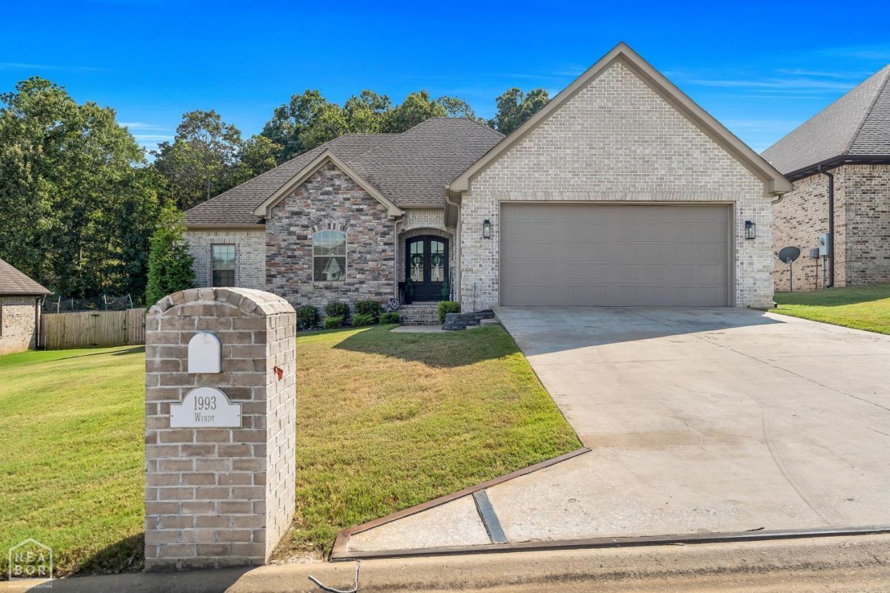Welcome to 1993 Windy Lane, a stunning retreat in Jonesboro's desirable Valley View Manor. This thoughtfully designed stone-and-brick home offers 2,001 square feet of well-planned living space with a split floor plan featuring 4 bedrooms and 2.5 baths. Perched on an elevated lot, the home provides beautiful landscaping and peaceful, tree-lined views best enjoyed from the covered wood deck. Just minutes from Highway 49 South, you'll love the quick access to schools, shopping, and all of your favorite local amenities. The exterior showcases timeless curb appeal with a stone-and-brick facade, an architectural shingled roof, seamless gutters, a freshly sealed driveway, and a garage finished with epoxy flooring and urethane coating. Inside the garage, you'll find attic access, built-in storage, a storm-shelter system, and plenty of room for two full-size vehicles. Step inside through striking double mahogany doors with glass accents into a welcoming foyer. The living room impresses with soaring ceilings, wood floors, and a cozy fireplace that is perfect for Arkansas' cooler nights. The open layout flows into an all-white kitchen featuring granite counters, a large island with bar seating, stainless appliances, under-cabinet lighting, and a double pantry. Generous windows flood the space with natural light and offer easy access to the covered back deck. The primary suite is a private oasis with a double tray ceiling, recessed lighting, and a spa-like en suite complete with a garden tub, tiled walk-in shower, granite dual vanity, and a massive walk-in closet. On the opposite wing, three spacious bedrooms share a Jack-and-Jill bath with another granite dual vanity. A convenient half bath and a well-organized laundry room with built-in cabinetry round out the thoughtful floor plan. In today's market, this beautiful property is sure to move fast. Don't miss your chance to schedule your private showing today and see why this home is the perfect fit!