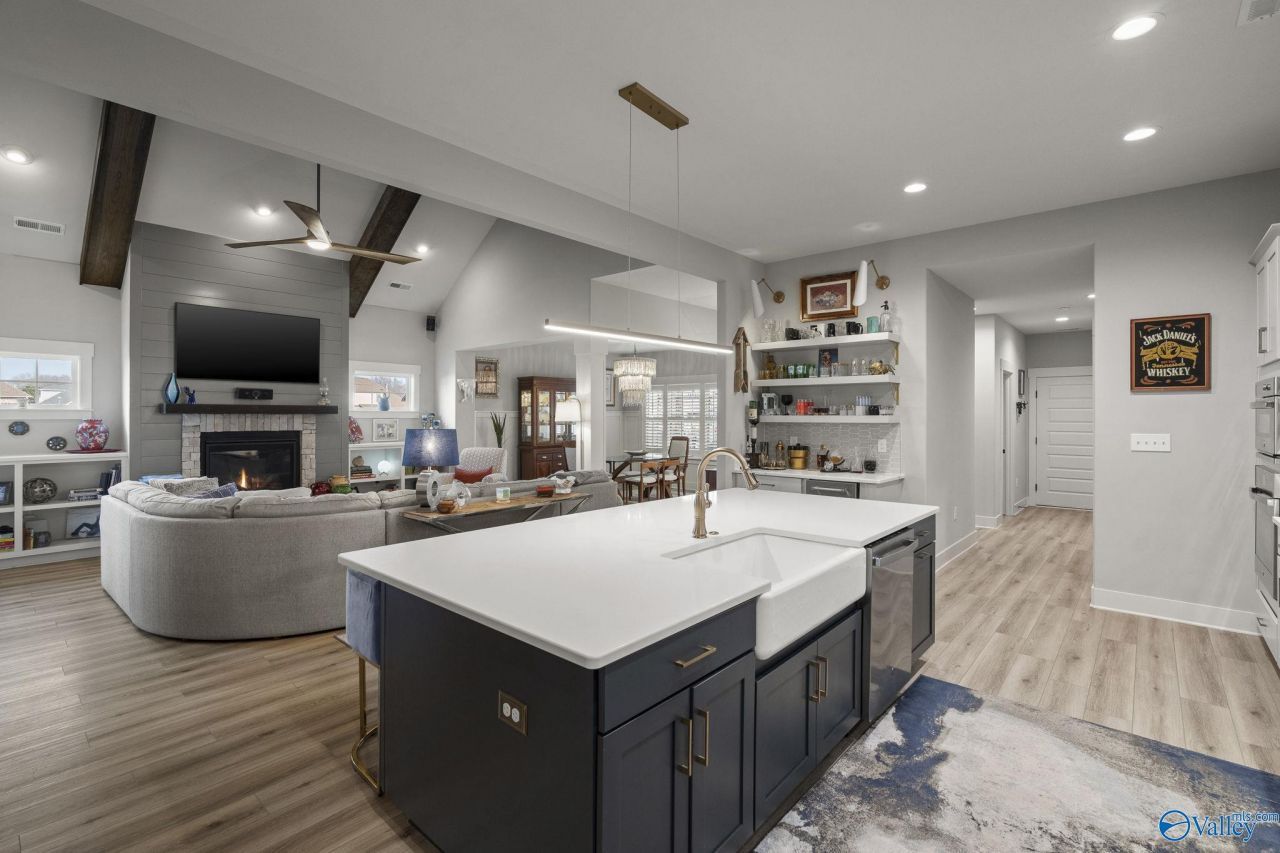 Only 15 minutes to Redstone Arsenal! Better than new Woodland Home?a beautifully upgraded and thoughtfully designed single story craftsman-style home. This 3-bedroom, 2.5-bath with an office features an open layout with vaulted ceiling and wood beams, stone and shiplap fireplace in the living room, designer lighting, built-in surround sound audio, and a stunning kitchen with oversized island, gas range top, pot filler, bar with ice machine, large walk-in pantry. Isolated primary suite with trey ceiling, spa bath with shower, tub, 2 walk-in closets. 2 additional bedrooms with walk-in closets and Jack & Jill bath. Enjoy a screened-in porch, privacy-fenced yard, and a dual entry driveway.