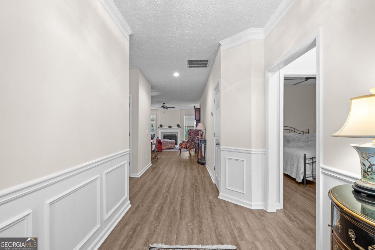 Welcome home to this beautifully updated 3BR/ 2 bath Woodstock gem featuring a welcoming covered entry, two-car garage, and fresh, modern finishes throughout. Step inside to an inviting foyer with elegant wainscoting and durable luxury vinyl plank flooring that flows into the main living areas. The heart of the home is the bright, open kitchen with stylish gray cabinetry, stainless steel appliances, a large center island with stone countertops, and designer pendant lighting- perfect for everyday living & entertaining. Enjoy a spacious fireside family room filled with natural light and an easy flow into the dining area. Unwind in the generous primary suite with tray ceilings and an ensuite bath featuring a double vanity, soaking tub, and separate shower. Secondary bedrooms are well-sized, and the home offers great storage throughout. Outside, relax on the expansive patio overlooking a private, wooded backyard- ideal for grilling, gathering, or quiet evenings at home. Neighborhood amenities include clubhouse, tennis courts, and a pool- plus additional recreation areas- making this one a must-see!