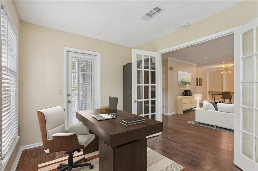 Come see this stylishly refreshed, move-in ready end-unit condo offering the perfect mix of comfort, modern design, and everyday convenience! Situated in the highly desirable Sandy Springs/North Buckhead area, this inviting home showcases luxury vinyl plank flooring throughout and an airy open-concept floor plan that seamlessly connects the living and dining spaces, great for both relaxing and entertaining. Recent upgrades include contemporary lighting, custom built-in shelving, and a well-appointed kitchen featuring granite countertops, crisp white cabinetry, tile flooring, stainless steel appliances, a breakfast bar, and a conveniently located laundry closet. The smart roommate-style layout enhances privacy, with the two bedrooms positioned on opposite sides of the unit. The spacious primary suite boasts plantation shutters, a large walk-in closet, and a private bath with an updated vanity. The secondary bedroom also enjoys its own refreshed vanity, maintaining a cohesive, modern feel throughout the home. A dedicated office enclosed with French doors provides the perfect work-from-home setup, filled with natural light and offering direct access to the private balcony, an ideal retreat for morning coffee or evening unwinding. Residents enjoy access to resort-style community amenities, including a sparkling pool, playground, and beautifully maintained green spaces. Conveniently located just minutes from Truist Park, you'll be close to premier dining, shopping, and entertainment. Easy access to I-285 and I-75 makes commuting simple, while nearby parks and trails offer great outdoor options. Located within top-rated Sandy Springs schools, this turnkey home delivers exceptional value in a prime location. Schedule your private showing today!