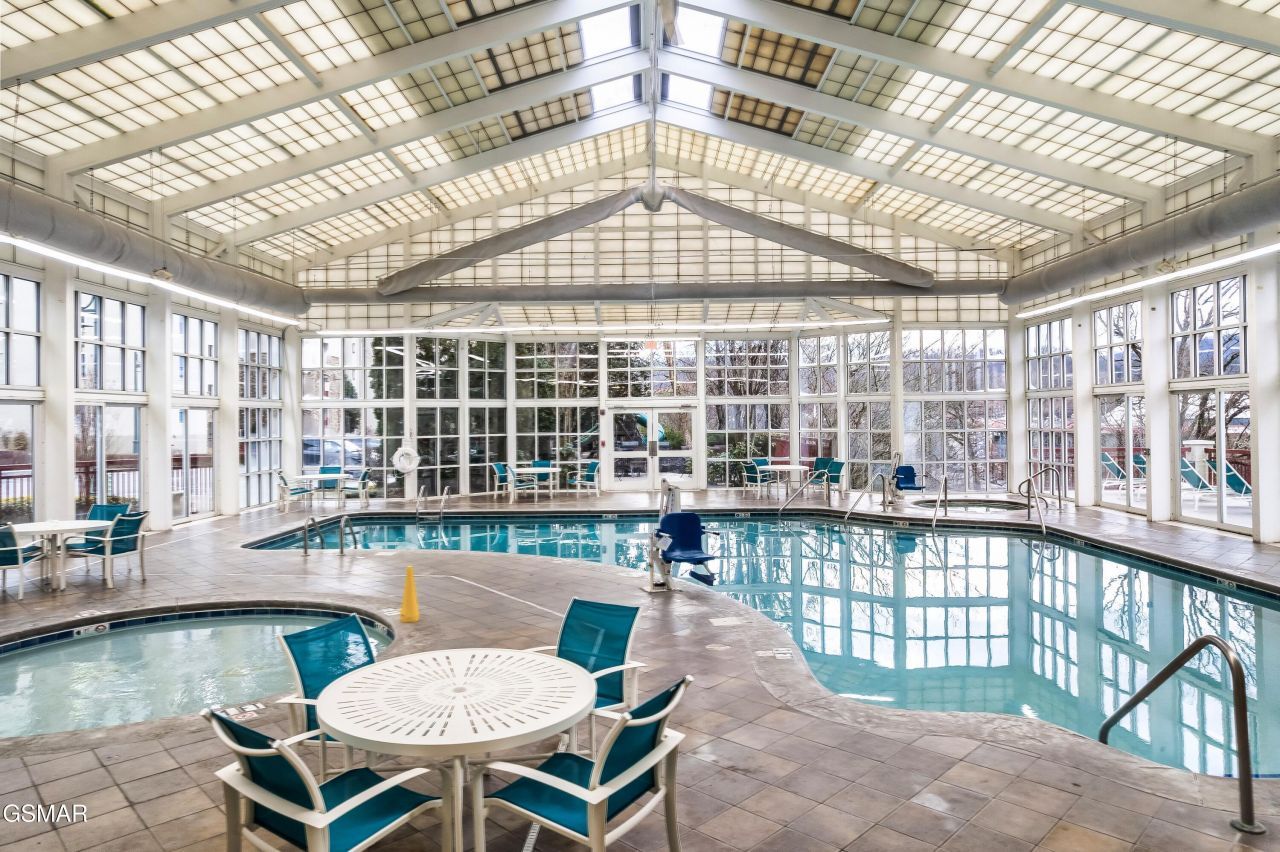 One of the THE BEST GOLF COURSE VIEWS the Smoky Mountains has to offer!!! This spacious & stately 3BR / 2BA condo at the premier RiverStone Resort & Spa sleeps 8 guests. Ideal for families or groups looking for resort-style comfort without sacrificing convenience.WALKING DISTANCE to the Parkway and downtown Pigeon Forge! Just a few minutes drive to Dollywood, shopping at The Island or malls, etc, etc. Want to avoid the scary roads that may ice over and cause winter cancellations? No scary roads here! Just the Parkway and one side road that will be among the first to be plowed and salted at the first sign of Jack Frost. The condo feature a stately entrance as soon as you step in with a large open concept living room and kitchen with a great breakfast bar. As you walk inside, you'll find a fully equipped kitchen, in-unit washer and dryer, complimentary Wi-Fi, and Smart TVs in the living area and master bedroom. The master suite features a king bed and a luxurious en-suite bath with a jetted tub and tile shower. A second king bedroom offers private deck access, while the third bedroom has two twin beds -- perfect for the kids. Cozy up by the seasonal gas fireplace on cooler evenings, or step out onto the sprawling back porch to take in the GORGEOUS GOLF COURSE VIEWS. As a RiverStone guest, you'll enjoy access to the resort's indoor pool, seasonal lazy river, fitness center, children's playground, picnic area, nature trail, and on-site spa. Covered and surface parking are both available right at the building. Some drone photographer used in listing photos.