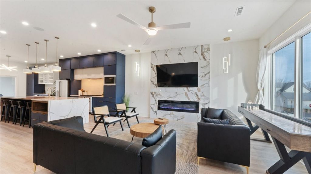 Experience modern luxury in the heart of Downtown Bentonville with this stunning townhome, just 0.9 miles from the new Walmart Campus. Enjoy the ultimate lifestyle?walk or bike to world-class art, dining, culture, and renowned mountain biking trails. This home exudes sophistication with a spacious living area featuring a striking wall of windows, a sleek linear electric tiled fireplace and open floorplan. The chef's dream kitchen boasts a custom waterfall island, floor-to-ceiling cabinetry, quartz countertops, high-end Café appliances, a wet bar/beverage station, and a formal dining room. The primary suite upstairs offers a private retreat with balcony, LVP floors, a spa-like ensuite with a floating vanity, a walk-in shower with rain head and jets, and a custom walk-in closet. Two secondary bedrooms on the 1st level, living/kitchen space on the 2nd level and primary bedroom and secondary bedroom on the 3rd level. Complete with a two-car attached garage. Current lease through 2027