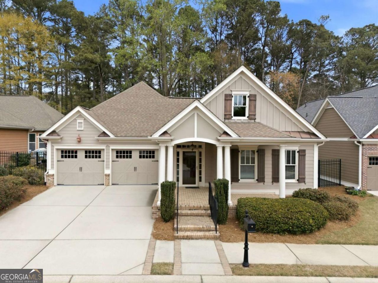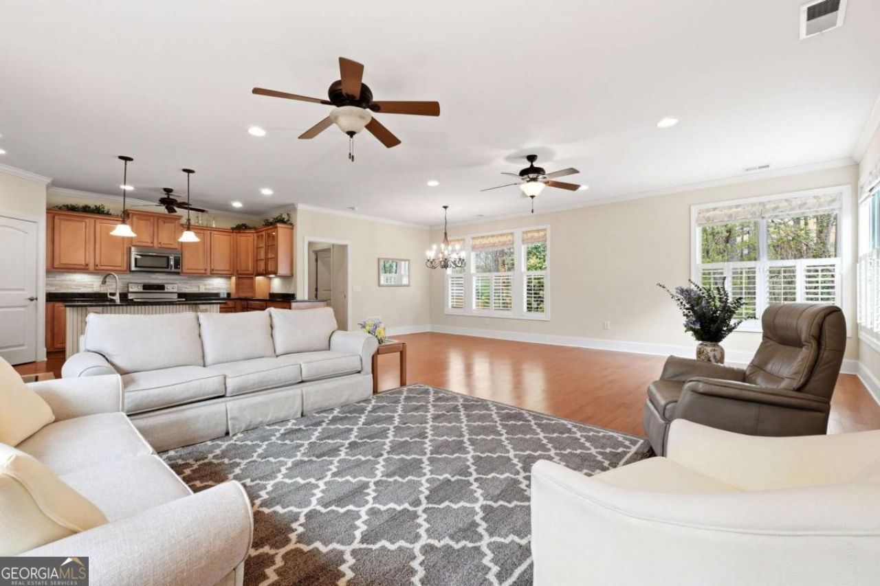 Welcome to Somerset, a serene gated community designed for active adults 55+. This beautifully maintained three-bedroom, two-bath home offers the perfect blend of comfort, convenience, and low-maintenance living-all on one level. Step inside to an inviting open-concept floor plan featuring rich hardwood floors, crown molding, and plantation shutters throughout the home. A wall of windows fills the space with abundant natural light-ideal for both everyday living and entertaining. Just off the main living area is a versatile open room without doors-perfect for a home office, library, or flex space to suit your needs. The spacious kitchen is a chef's delight, boasting custom cabinetry with pull-out shelving, a large walk-in pantry, generous counter space, and a full suite of appliances including an electric range, microwave, dishwasher, and refrigerator, plus a functional center island. The private primary suite is thoughtfully positioned at the rear of the home and features neutral tones, two oversized walk-in closets, and a luxurious en-suite bath complete with double vanities and a large walk-in shower. Two additional bedrooms on the main level provide flexibility for guests or hobbies. The oversized laundry/mudroom, located just off the garage, includes built-in cabinetry, a utility sink, and folding counter space for added convenience. Enjoy outdoor living in your private courtyard patio, complete with an electric awning-perfect for relaxing in the shade. The two-car garage offers additional space for storage, a workshop, or hobbies, and the walk-up attic provides excellent storage or the potential to be finished into a bonus room. Somerset residents enjoy professionally maintained landscaping and a variety of community amenities, including a clubhouse, fitness room, and social events. Conveniently located just minutes from medical facilities, downtown Woodstock, shopping, dining, and scenic walking trails, this home offers a peaceful yet connected lifestyle. Experience easy living in a vibrant, welcoming community-your next chapter starts here.