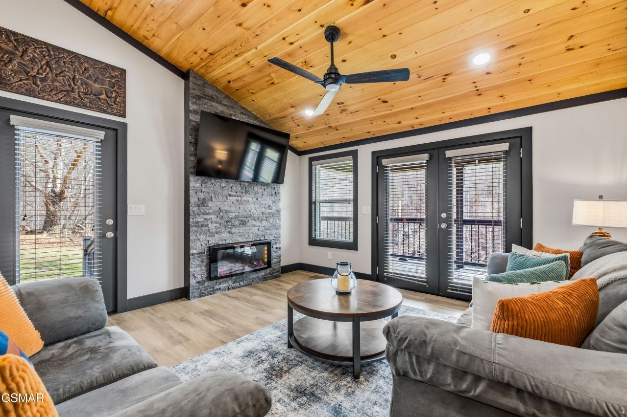 No HOA. No restrictions. Fully furnished. One acre. And a deck overlooking a beautiful horse farm. Tucked away on a peaceful one-acre setting in the heart of Sevierville, this modern cabin offers the perfect blend of privacy, style, and flexibility. Whether you're looking for a private personal retreat, full-time residence, or income-producing overnight rental, this one checks every box. Step inside to soaring tongue-and-groove ceilings, an open and airy floor plan, and a stunning stone fireplace that anchors the main living space. The beautifully designed kitchen features granite countertops, stainless appliances, and a large island perfect for gathering with family and friends. Downstairs offers additional living and sleeping space, ideal for guests or maximizing rental potential. Outside is where this property truly shines. The expansive covered deck overlooks a scenic horse farm and rolling countryside, creating the perfect place to enjoy your morning coffee or unwind in the evenings. Being sold fully furnished with gorgeous, well-appointed furnishings, this home is completely turnkey. Just bring your clothes and start enjoying immediately. No HOA and no restrictions, allowing for overnight rentals, personal use, or both with complete flexibility. Easy, level parking with plenty of space for multiple vehicles. Conveniently located just minutes from Sevierville, Pigeon Forge, and Gatlinburg, yet tucked away enough to enjoy the peace, quiet, and beauty of the Smoky Mountains.