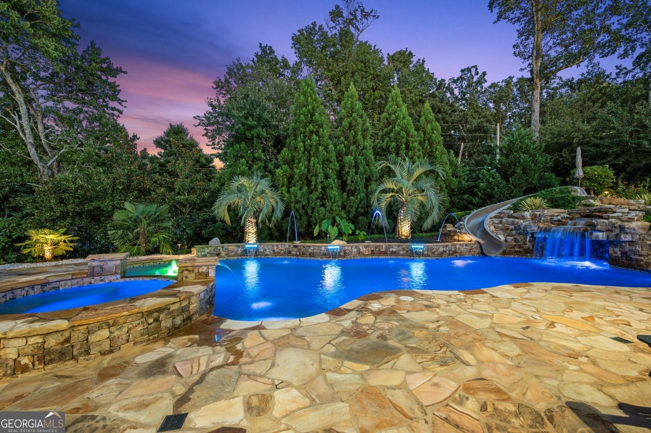 Welcome to this luxurious four-sides brick estate in the coveted Greystone Manor subdivision, where exquisite craftsmanship, timeless architectural beauty and modern smart-home conveniences come together in perfect harmony. Thoughtfully designed for gracious entertaining and everyday comfort, this extraordinary residence offers an inviting open-concept layout filled with light, elegance and warmth. Inside, the dramatic two-story foyer welcomes you, where soaring 12-foot ceilings create a grand sense of arrival. Beyond, discover a handsome beam and vaulted office, a sophisticated formal dining room and a gourmet chef's kitchen that is sure to impress. The kitchen shines as the heart of the home, showcasing stainless steel appliances, gleaming granite countertops, custom cabinetry, a spacious walk-in pantry and an expansive butler's pantry ideal for hosting. A sunny breakfast room flows into the welcoming keeping room with a fireplace, while a charming screened porch and deck extend living outdoors. Every detail has been thoughtfully curated, from the mudroom and three laundry rooms to the custom built-ins and a sitting room with a fireplace. The main-level primary suite offers a peaceful sanctuary with a spa-inspired bathroom featuring dual showers and generous dual custom closets. Upstairs, secondary bedrooms are generously sized, and each enjoys a private en suite bathroom. The finished terrace level is designed with versatility in mind, featuring a private in-law suite, a fully equipped gym with mirrored walls and rubber flooring and expansive spaces for recreation and relaxation. Outside, you will discover your own resort-inspired oasis. Over $595,000 in capital improvements have transformed the grounds into a breathtaking retreat, highlighted by a custom heated saltwater pool with stonework, waterfalls, lush tropical landscaping and professional terraforming. Evenings are magical with Brilliance Wi-Fi-controlled uplighting, a custom underdecking system with flood lighting and an outdoor kitchen boasting a 38-inch Brahma by Bull built-in grill with access doors. A fenced backyard and meticulously maintained landscaping complete this picture-perfect setting. Additional luxuries include a four-car garage with custom poured flooring, a custom executive office, refinished hardwood floors, a freshly repainted exterior and upgrades such as a Samsung Smart refrigerator, ensuring both beauty and function at every turn. This exceptional residence offers more than just a home it presents a rare resort-style lifestyle in a private, gated community, perfectly blending luxury, comfort and convenience.