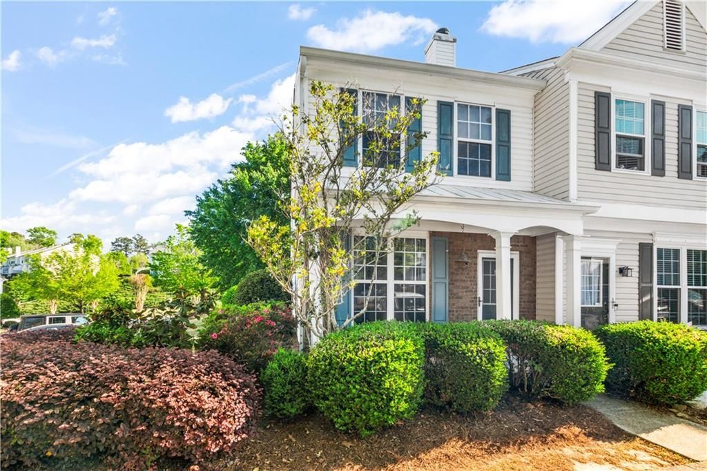 This end-unit townhouse in Alpharetta's Devonshire community offers a perfect blend of comfort and convenience. Ideally located near major interstates, premier shopping, and local parks. Inside, the main level features high ceilings and a bright, open-concept floor plan illuminated by natural light. The heart of the home is the inviting open concept family room, anchored by a classic gas fireplace?perfect for relaxing evenings. The kitchen is outfitted with custom cabinetry, granite countertops, and a sliding glass door that leads directly to a private back patio. This quiet outdoor space includes a dedicated storage room and a wooded view, providing a serene backdrop for morning coffee or weekend grilling. Upstairs, the home features a well-designed split-bedroom plan for maximum privacy. Each of the two spacious bedrooms includes its own updated en-suite bathroom. The primary suite is a true retreat, vaulted ceilings, a large closet, and a double vanity. Residents of Devonshire enjoy access to excellent community amenities, including a clubhouse, swimming pool, and tennis courts. Zoned for the Centennial High School district, this move-in-ready property offers a low-maintenance lifestyle in the heart of one of Georgia's most sought-after areas.