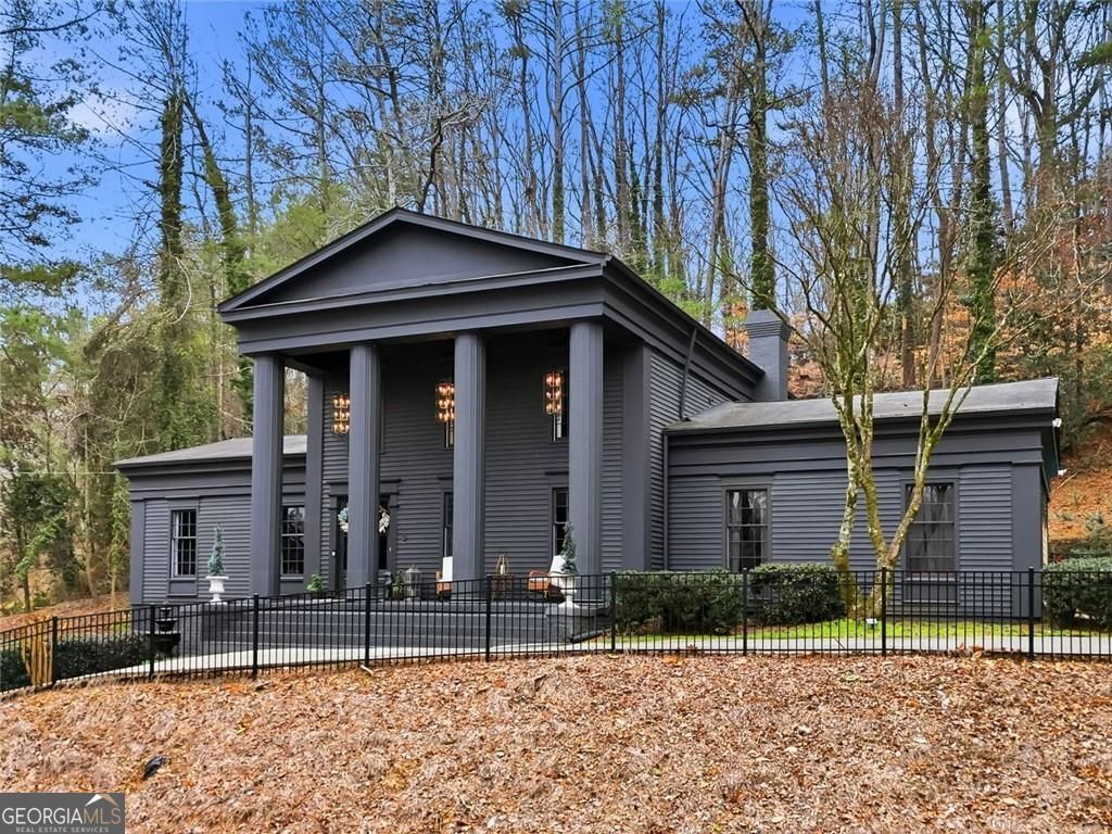 A gated Greek Revival estate reimagined in Iron Ore by Benjamin ChiMax sits atop a gentle hill just steps from the Chattahoochee River. Historic gravitas integrates modern refinement the moment you enter the grand two-story foyer with preserved moldings and sweeping lines. The main level includes a gracious living room, a flexible study/optional bedroom, and a newly updated kitchen with quartz counters, crisp subway tile, and all-new appliances. The kitchen opens to a breakfast bar formal dining room. French doors lead to an expansive covered patio and heated saltwater pool framed by mature trees. A standout offering is the 22-seat cinema room perfect for immersive movie nights. Upstairs, a serene owner's suite features high ceilings, an oversized walk-in closet, romantic Juliet balcony overlooking the landscape, and bath with a marble shower and soaking tub inviting relaxation at day's end. Secondary bedrooms are bright and private. Expanding the home's versatility, the terrace level adds a large recreation room with a bar, bed, and full bath. A sweeping wrap-around driveway offers ease abundant parking for guests. Set along one of Sandy Springs' most storied corridors and just a short walk from the Chattahoochee River, the home offers beautiful views along historic Spalding Drive. Its ideal location places you minutes from Dunwoody Country Club, Perimeter Center, top schools, and major routes-including GA-400 and I-285-with quick access to the King & Queen building (11 minutes) and Avalon (13 minutes). A compelling mix of heritage, convenience, and enduring style.