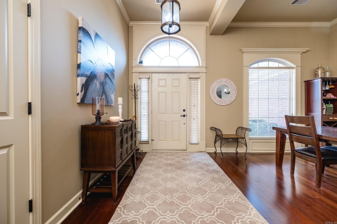 Located on a large corner lot in highly desirable Epernay place of Chenal Valley, this home offers an ideal blend of space, functionality, & community amenities such as multiple neighborhood pools, playgrounds, & fitness trails. Inside, the living room features a vaulted ceiling with wood beams & a gas fireplace, creating a warm & inviting focal point. Hardwood floors flow throughout the main living areas, complimented by a separate dining room & a thoughtfully designed split floor plan. The kitchen is equipped with granite countertops, stainless appliances, a gas range, eat at bar, & a breakfast area perfect for everyday living & entertaining. 2 BRs share a Jack & Jill style bathroom on one side of the home while the primary suite is privately situated on the opposite side alongside an additional bedroom or office. The spacious primary retreat boasts a large en-suite bath and an impressive walk-through closet offering abundant storage. Relax on the partially covered back deck overlooking the fully fenced, flat backyard. This well maintained home has the added bonus of a brand new roof, gutters, and downspouts all on a single level! So it is move in ready & perfect for EVERYONE!