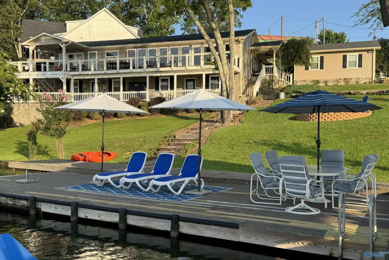 Luxury waterfront home on Weiss Lake with approx. 220 feet of prime shoreline and expansive big-water views. Gentle slope with about 30 steps to a private dock featuring a pontoon lift, two jet ski lifts, fire pit, and generous entertaining space. This 4BR/4BA, 2,470 sq ft home offers open-concept living with panoramic lake views, a primary suite with spa-style bath, and a finished lower level with media area, second kitchen, guest suite, and full bath. Secure 1½-car garage with workspace and storage. Quiet cul-de-sac location, minutes to Leesburg Landing, shopping, and dining. Optional furnishings available.
