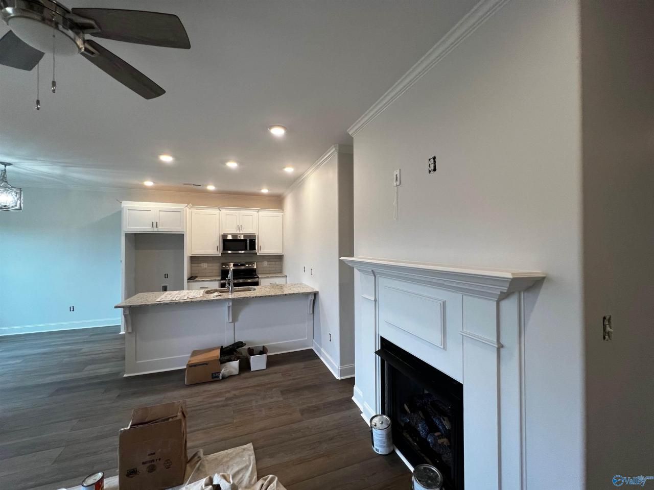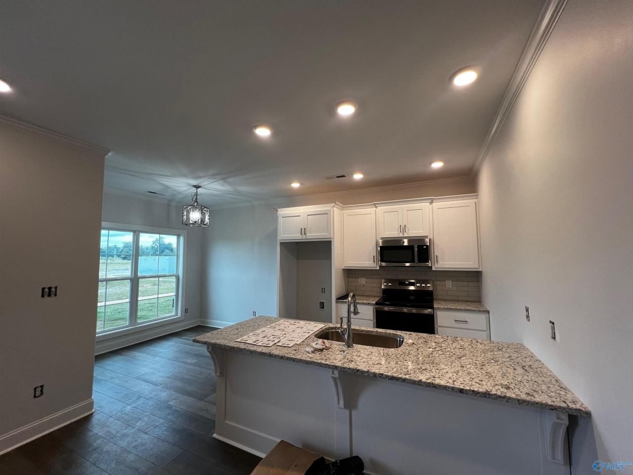 The Breakers Townhomes offering great location in eastern Limestone county midway between Madison & Athens. 2 bedroom, 2-1/2 bath townhome offers living room with gas log fireplace open to kitchen. Space saving kitchen boasts granite counters, tiled backsplash, recessed lighting and dining area. Luxury vinyl plank flooring throughout. Primary bedroom offers private bath with tiled shower & walk-in closet plus 2nd walk-in off BR. Large 2nd level laundry rm convenient to bedrooms. Single garage for inside parking. Community storm shelter just steps away and community clubhouse available to all residents. Quality built by Lynn Persell Home Builders!