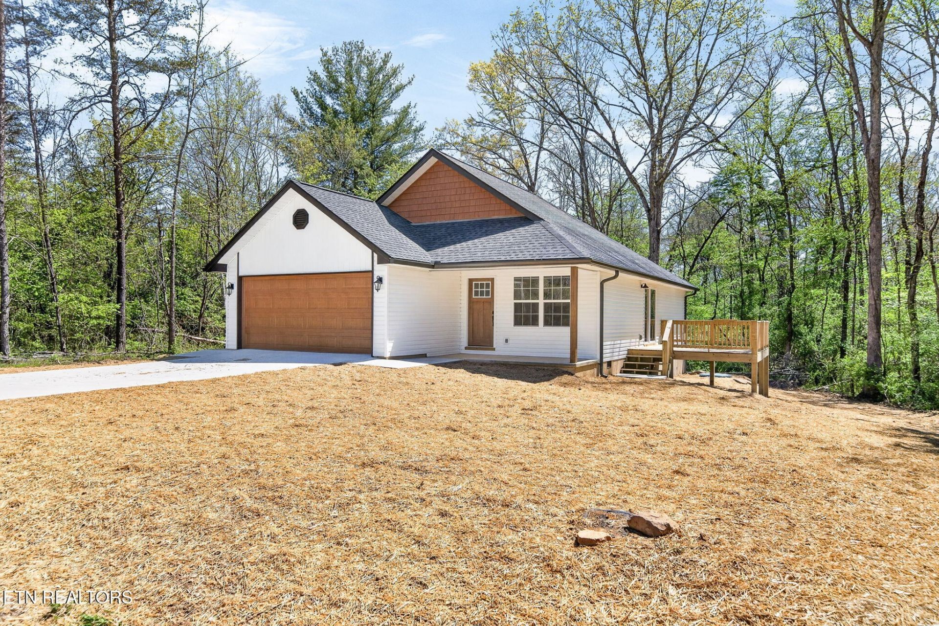 Brand-New Construction on a Quiet Corner Lot with No HOA! Take a look at this new construction, situated on a quiet street on a spacious .34-acre corner lot with NO HOA. This home features 3 bedrooms, 2 bathrooms, 1,228sf of living space, plus an oversized 2-car garage with 440sf. Inside, you'll love the open floor plan connecting the living room, dining area, and kitchen, with a vaulted ceiling for an open feel. A sliding glass door from the kitchen/dining area leads to the deck. Durable LVP flooring runs throughout the main living areas and bedrooms, with tile flooring in the bathrooms and laundry room. The kitchen features white shaker cabinets, granite countertops, a single-bowl sink, pantry, and stainless steel appliances, including a gas range, dishwasher, over-the-range microwave, and refrigerator. The primary suite has a trey ceiling, ceiling fan, walk-in closet, and a private bath featuring a double-sink oversized vanity with granite top, walk-in shower, and tile flooring. Both guest bedrooms include ceiling fans, closets, and LVP flooring. The guest bathroom includes a tub/shower combo, tile flooring, and a granite-top vanity. Outside, the vinyl exterior has great curb appeal with board & batten and shake accents for added character. Enjoy outdoor living with both a covered porch and an open deck. Built with efficiency in mind, this home includes natural gas HVAC and a tankless water heater - never run out of hot water. The oversized 2-car garage includes an upgraded insulated door, and the oversized concrete driveway provides plenty of parking space. A tree buffer surrounding the home adds extra privacy and a peaceful setting. Conveniently located just minutes to town, this property has been recently annexed into the city and is connected to city sewer, so no septic worries. Added peace of mind comes with manufacturer warranties plus a 1-year builder's warranty.