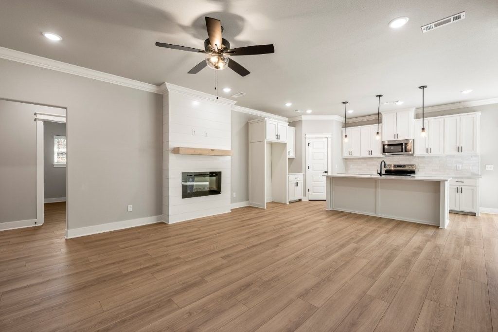 Modern style meets comfortable living in this stunning split 3-bedroom, open concept home surrounded by peaceful wooded views. The inviting main living area features warm LVP flooring, crown molding, & a sleek shiplap fireplace that flows seamlessly into a bright, airy kitchen w/ soft close custom cabinetry, stainless appliances, large island, & designer pendant lighting. A spacious breakfast nook offers natural light & a perfect everyday dining spot. The private primary suite includes a beautiful custom tile walk in shower with a pebble stone floor & transom window & separate vanities for added convenience. Thoughtful finishes, clean lines, & a functional layout make this home ideal for both relaxing & entertaining. With its contemporary exterior, refined interiors, & serene setting, this property delivers style, comfort, & exceptional livability located near the back 40 trails, all in Bentonville School District. $0 down payment/100% financing available!